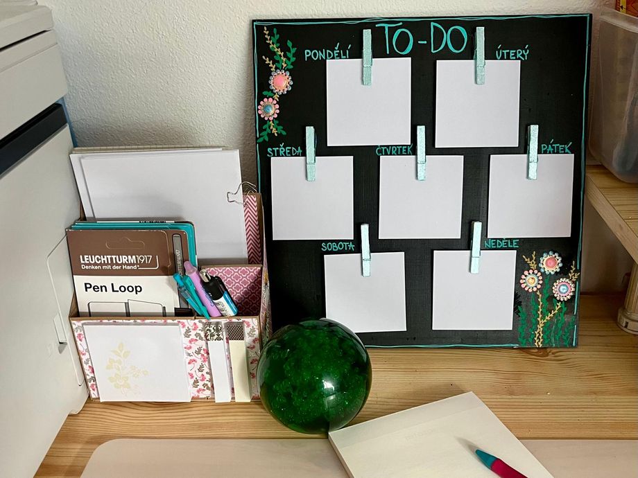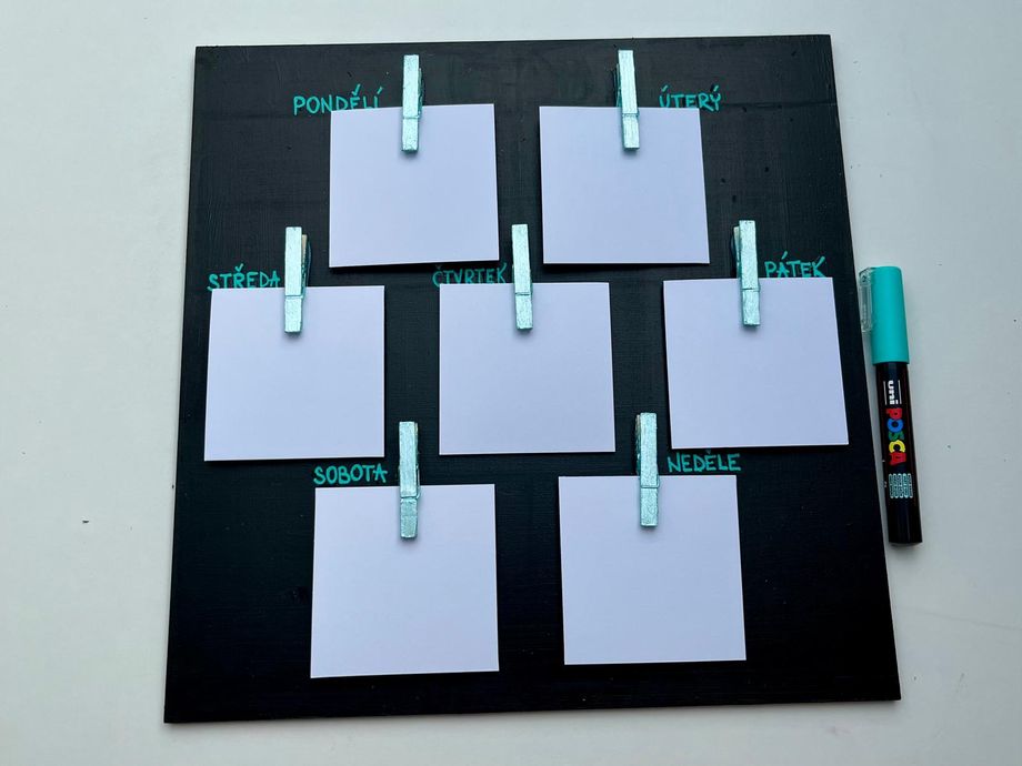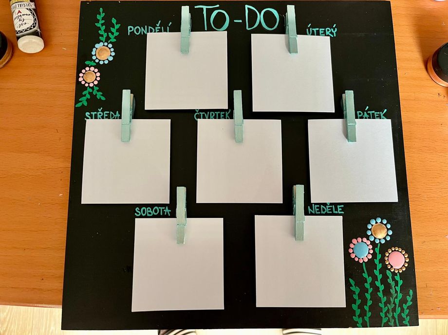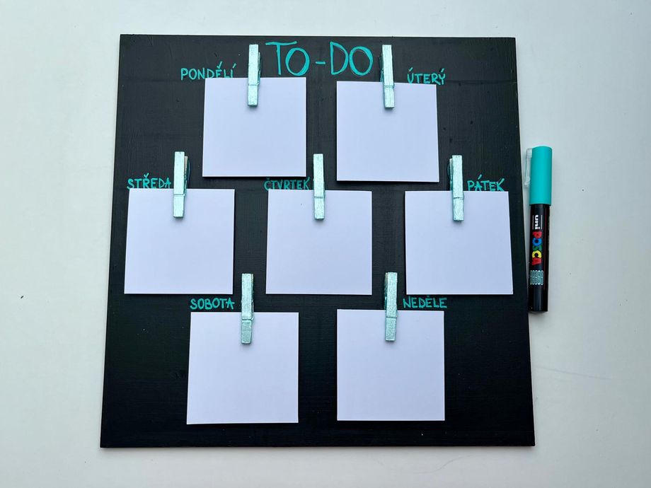 TO-DO nástěnka Návody 5. 6. 2025 Udržet přehled nad všemi úkoly, nápady a povinnostmi ve školním roce není vždy snadné. V našem jednoduchém návodu vám ukážeme, jak si vytvořit přehlednou TO-DO nástěnku, která bude praktickým pomocníkem v kabinetu, ve třídě i doma. Pomůže udržet pořádek ve školních projektech, povinnostech, plánech i nápadech. Stačí pár jednoduchých materiálů, trocha fantazie a praktický organizér je na světě. Udělejte si v úkolech pořádek – zábavně a po svém! Aktuality Pro paní učitelku a pana učitele Back to School Materiál a pomůcky: Dřevěný výřez čtverec 30x30 cm Černá akrylová barva Štětec Menší dřevěné kolíčky 7 ks Metalická akrylová barva mátová Bílý papír Akrylový fix POSCA zelený Lepicí tavná pistole Postup: 1. Přední stranu a boky dřevěného čtverce nabarvíme černou akrylovou barvou. 2. Dřevěné kolíčky nabarvíme metalickou akrylovou barvou v mátovém odstínu. 3. Rozmyslíme si, jak budeme chtít rozmístěné kolíčky a uděláme si na tabuli značky, kam je přilepit a poté připevníme tavnou pistolí. 4. Z bílého papíru vystřihneme čtverečky veliké 7,5 x 7,5 cm. Budeme jich potřebovat celkem 7 ks – pro každý den v týdnu jeden. 5. Zaklapneme do kolíčků. 6. Vedle kolíčků napíšeme jednotlivé dny v týdnu, použijeme k tomu akrylový fix v zelené barvě. 7. Potom ještě stejným fixem připíšeme nadpis TO – DO. 8. Nakonec dozdobíme – tečkovacími nástroji a akrylovými barvami namalujeme kytičky, fixem dokreslíme stonky a lístky……a úplně jako poslední nakreslíme akrylovým fixem barevný rámeček. 9. A teď už můžeme začít plánovat! Naše tipy: Podobnou tabuli můžete vyrobit ze staré korkové nástěnky. Dá se postavit na pracovní stůl, polici nebo zavěsit na stěnu. Pokud jste paní učitelka, můžete si ji vytvořit společně s žáky jako zábavnou tvořivou aktivitu. K výrobě nástěnky můžete použít i jiné tvary – obdélník, šestiúhelník, kruh, rámeček apod. Jako papírky, které se budou každý týden měnit, můžete použít některý z našich samolepicích bločků od Wrendale Designs. K plánování můžete využít některá z našich diářových razítek. Produkty, které by vás mohly zajímat (5) Kód: G2251Z Dřevěný výřez - Čtverec, velký -40% Doporučujeme Kód: 0033135 Akrylová barva Cadence Premium, 70 ml Doporučujeme Kód: 0038273 Metalická akrylová barva Dora Metallic, 50 ml Kód: 0033187 Akrylový fix Posca PC-1M -25% Kód: 0500002 Tavná lepicí pistole TAV-15 Zpět do kategorie Další podobné články Návody Papírový hrníček na vánoční dárečky 7. 11. 2025 Hledáte drobný, ale osobitý dárek, který potěší každého? Vyrobte si s námi kouzelný papírový hrneček – milou kapsičku, do které schováte čaj, kávu nebo malou čokoládu. Jednoduchý projekt, který zvládnete během chvilky a zaručeně vykouzlí úsměv na tváři všem kolegům v práci i přátelům! Návody Sváteční lucerničky 6. 11. 2025 V předvánočním čase plném světýlek a vůně perníčků potěší každé malé kouzlo, které si vytvoříme sami. Připravili jsme jednoduchý návod, podle kterého si doma vyrobíte jemně zářící adventní lucerničku, která zútulní váš domov a potěší nejen děti. Vytvořte si kouzelnou atmosféru! Návody Adventní kalendář z roliček 5. 11. 2025 Recyklovaný adventní kalendář, který skvěle vypadá? Použijte roličky od toaletního papíru! Je to nápadité, snadné a děti vám určitě rády pomůžou.