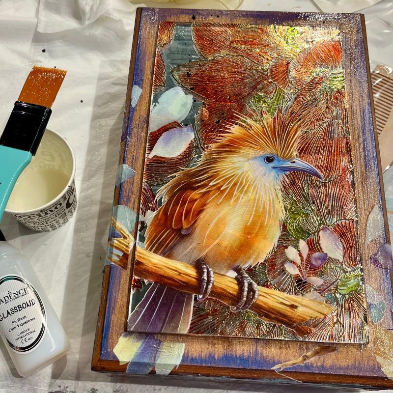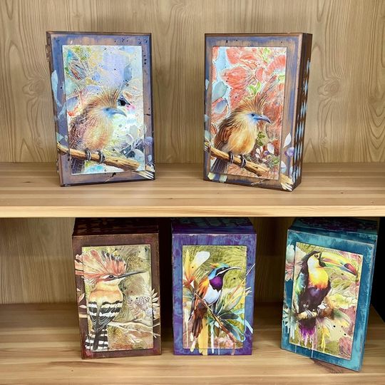 Nejdříve budeme malovat matnými barvami a šablonovat přímo na dřevo, pak se vrhneme na zdobení zrcadla. Ukážeme si práci s propisoty, ale hlavně s nápadnými transferovými obrázky, s jejichž pomocí si na šperkovnice přeneseme obrázky ptáků ohniváků, tukanů a sov.