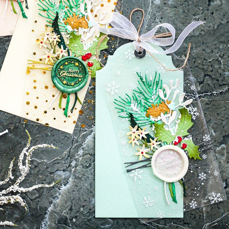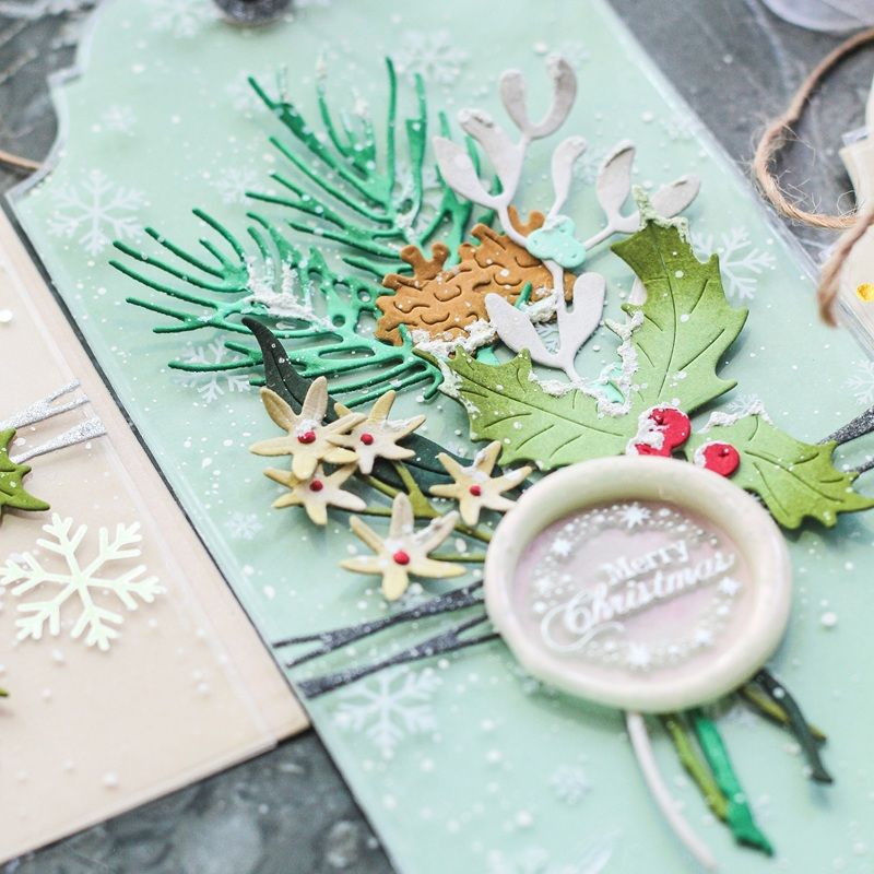 Pevná průhledná fólie s potiskem sněhových vloček. Použít můžete celé archy nebo jen detaily, které lze vystřihnout, popř. vyřezat na strojku typu Big Shot nebo pomocí raznic.
