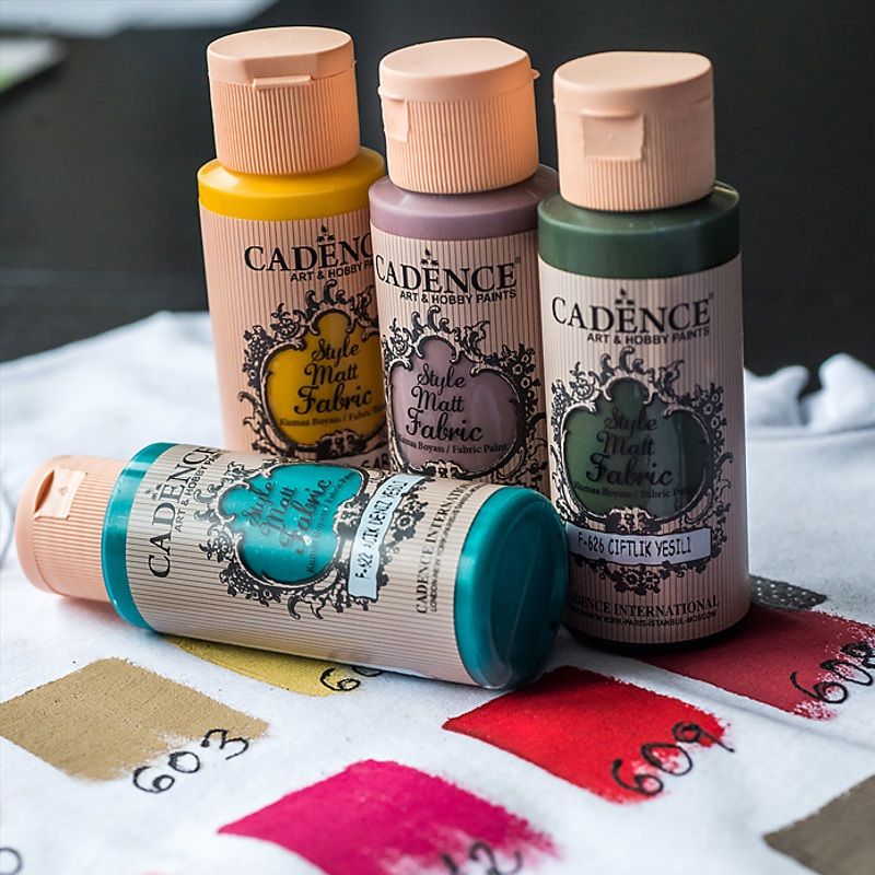 Barvy Style Matt Fabric od firmy Cadence jsou sytě pigmentované textilní barvy na vodní bázi. Jsou vhodné na přírodní vlákna (bavlna, len, hedvábí) a látky s minimální příměsí umělých vláken. Mají jemnou krémovou konzistenci, nemusí se ředit a jednotlivé barvy se dají vzájemně míchat. Namalovaný textil zůstává pružný, příjemný na nošení.