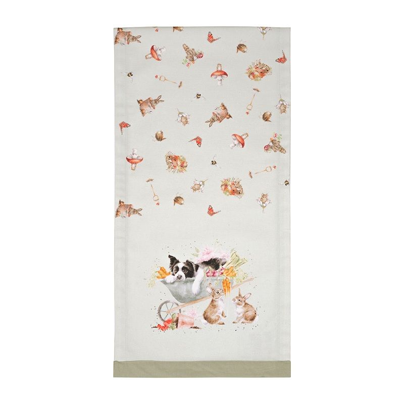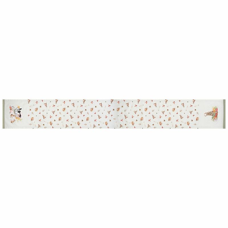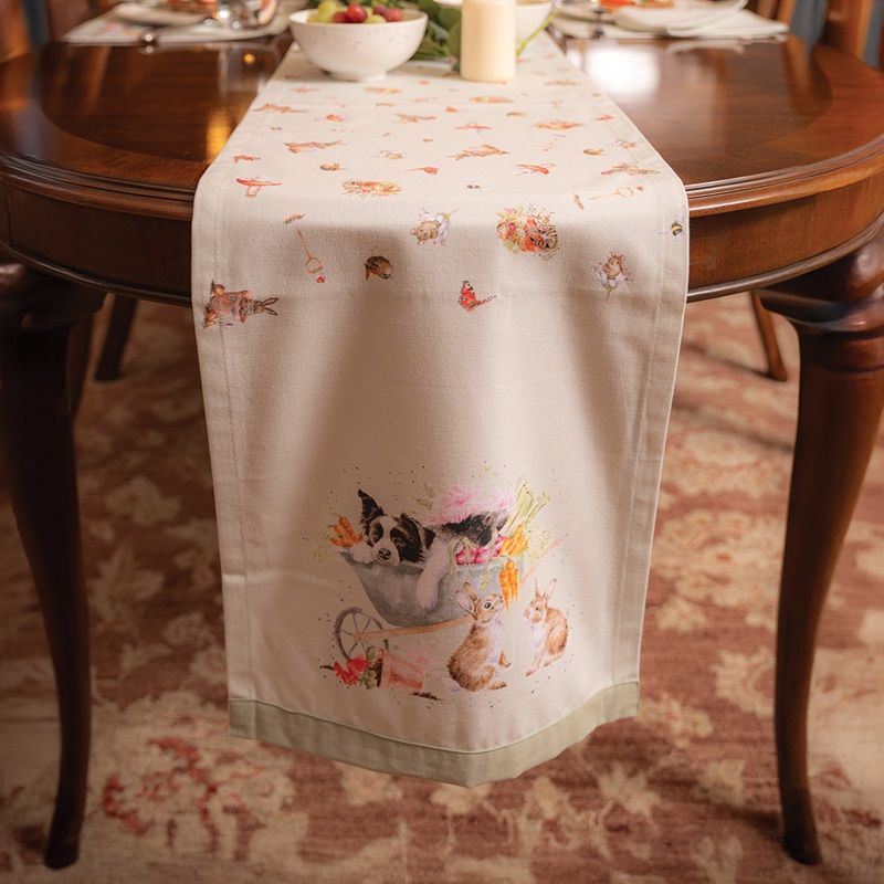 Designový běhoun na stůl je unikátním doplňkem, který dodá domovu na atmosféře a eleganci. Na rozdíl od klasického ubrusu je velmi úzký a umisťuje se doprostřed stolu, buď na samotnou desku nebo přes sladěný ubrus. Je velmi dlouhý proto, aby mohly jeho konce elegantně splývat a nechat zazářit velké akvarelové ilustrace pejska a králíků. Díky neutrální zelenkavě barvě a tmavě zelenému lemování se bude hodit do jakékoli domácnosti, obzvlášť na velký jídelní stůl.