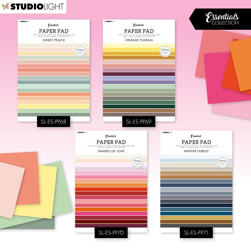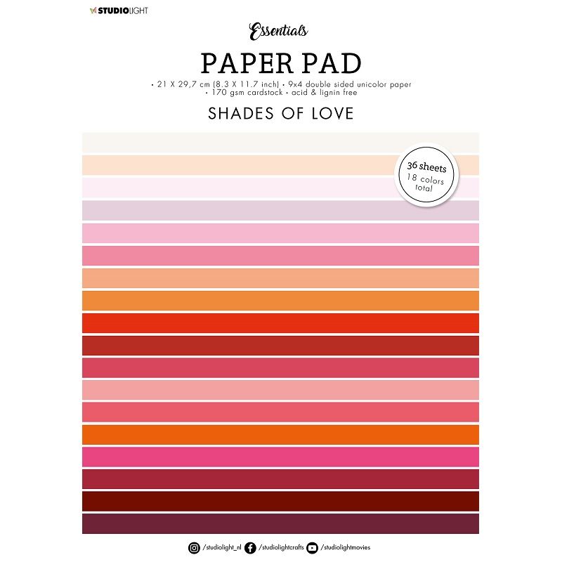 Sada jednobarevných papírů pro kreativní tvorbu v romantických barvách. Papíry využijete na scrapbooking, cardmaking, project life a další papírové tvoření. V bloku je 36 listů (2 x 18 barevných designů) o rozměru A4 s matným oboustranným potiskem. Papíry jsou bez kyseliny a neobsahují lignin, gramáž 170 g/m2.