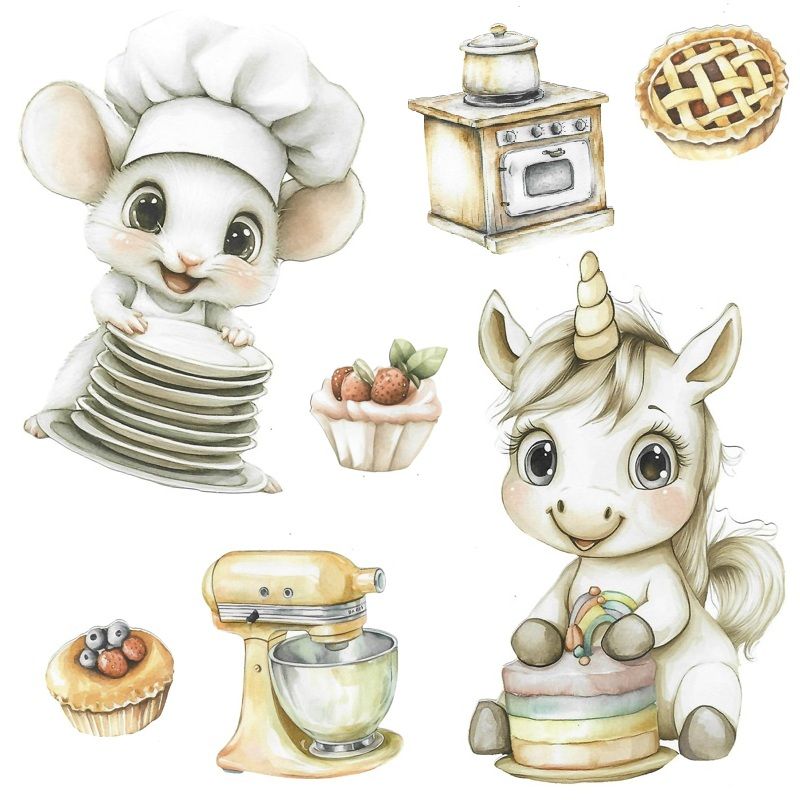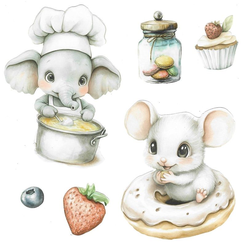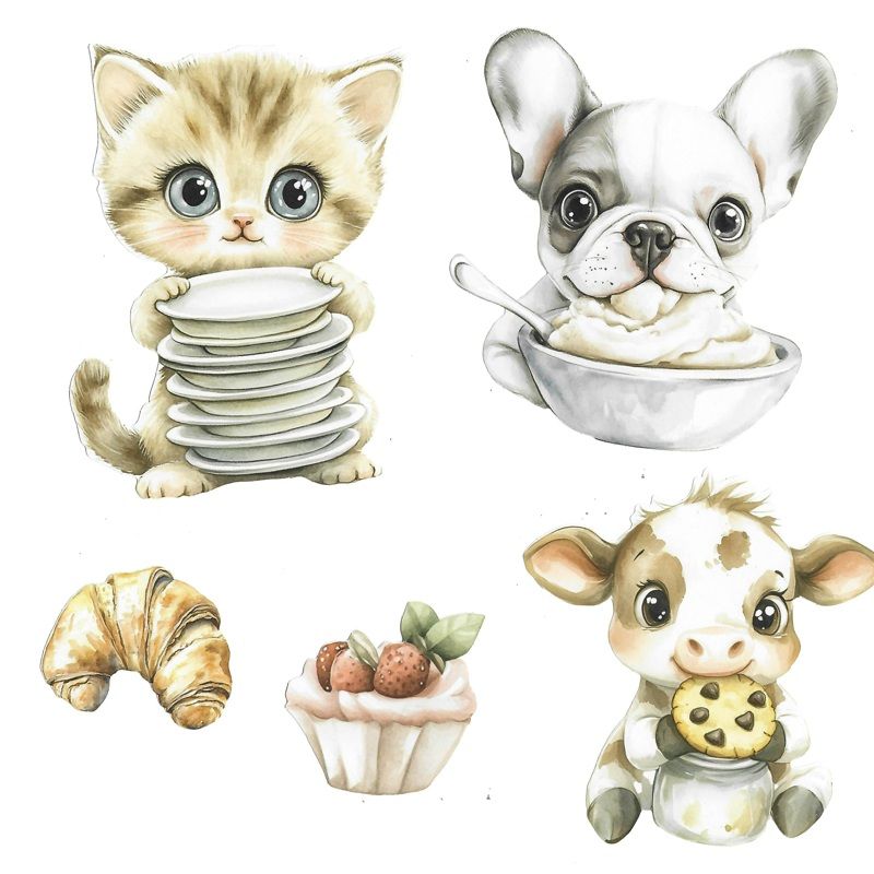 Sada dekorativních papírových výseků s motivy roztomilých zvířátek a sladkých dobrot určených převážně k papírovému tvoření. Obrázky jsou obzvlášť vhodné na stránky art journalu, scrapbooku nebo na cardmaking – výrobu přání. Žádný z motivů není třeba vystřihovat, stačí jen nalepit na projekt pomocí tekutého lepidla , lepicí pásky nebo lepicích 3D polštářků.