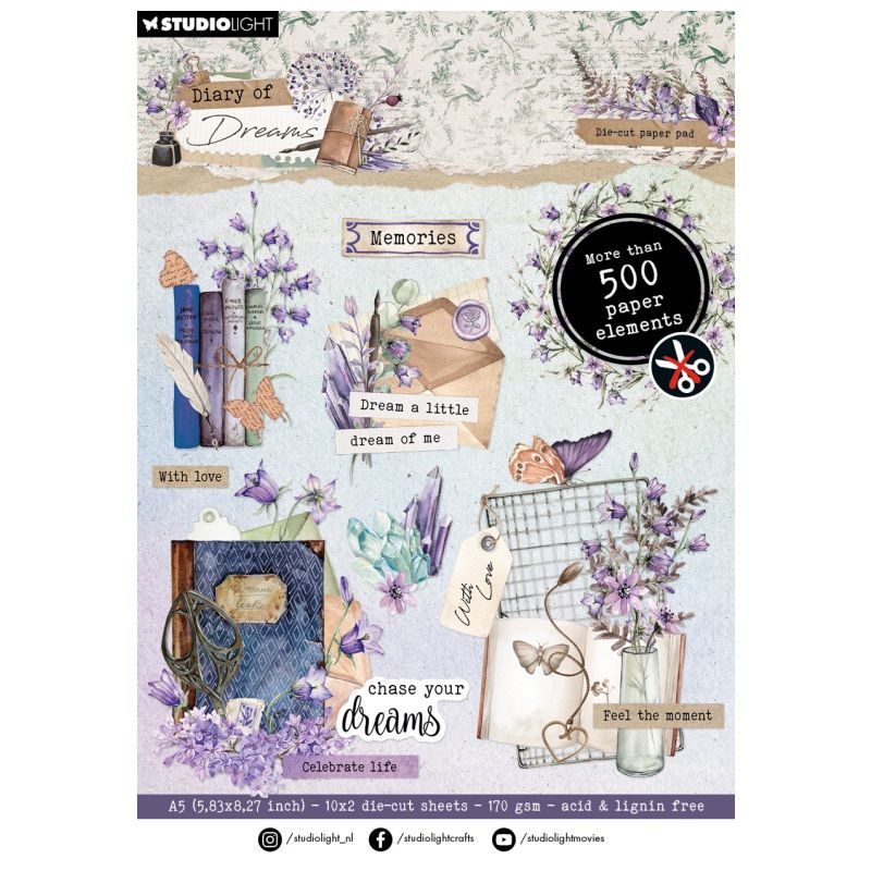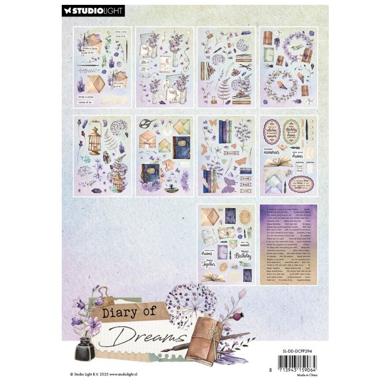Blok papírových obrázků v kreativním bloku ze zasněné kolekce Diary of Dreams. Jednotlivé motivy jsou předvyseknuté, obrázky stačí ze stránky pouze vyloupnout k dalšímu tvoření, nemusí se vystřihovat.