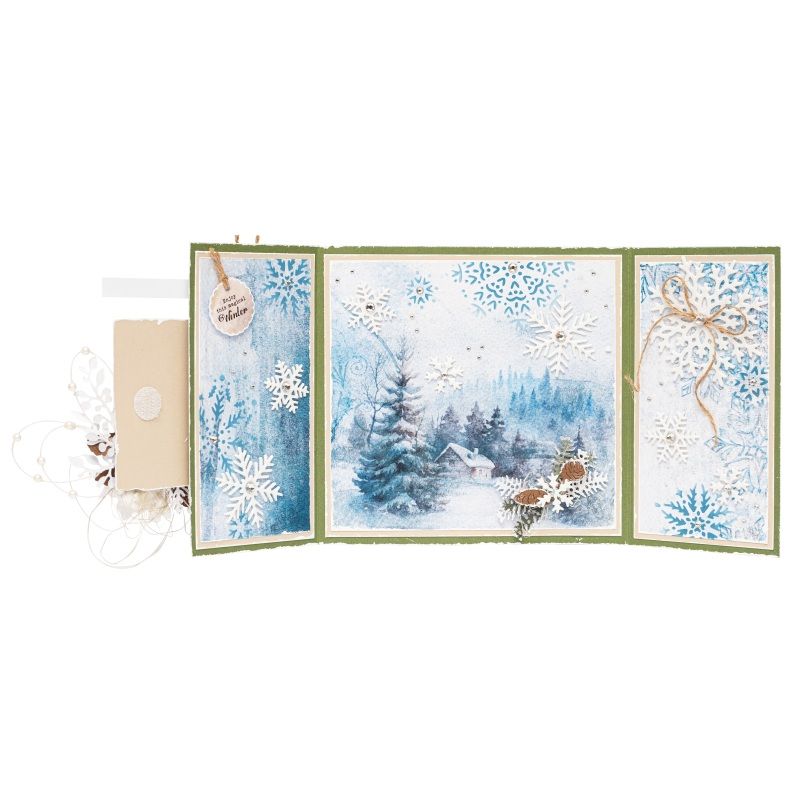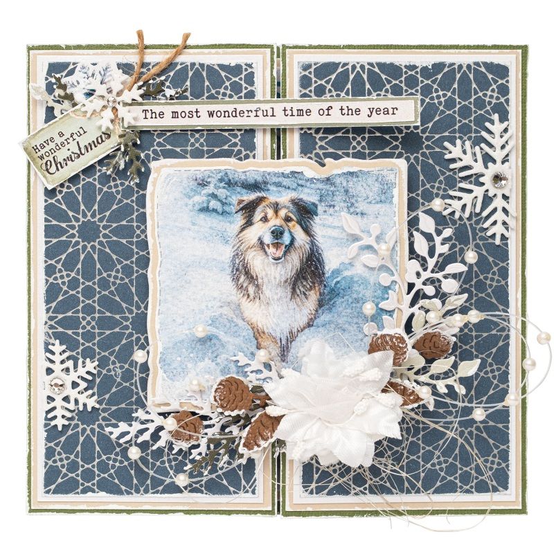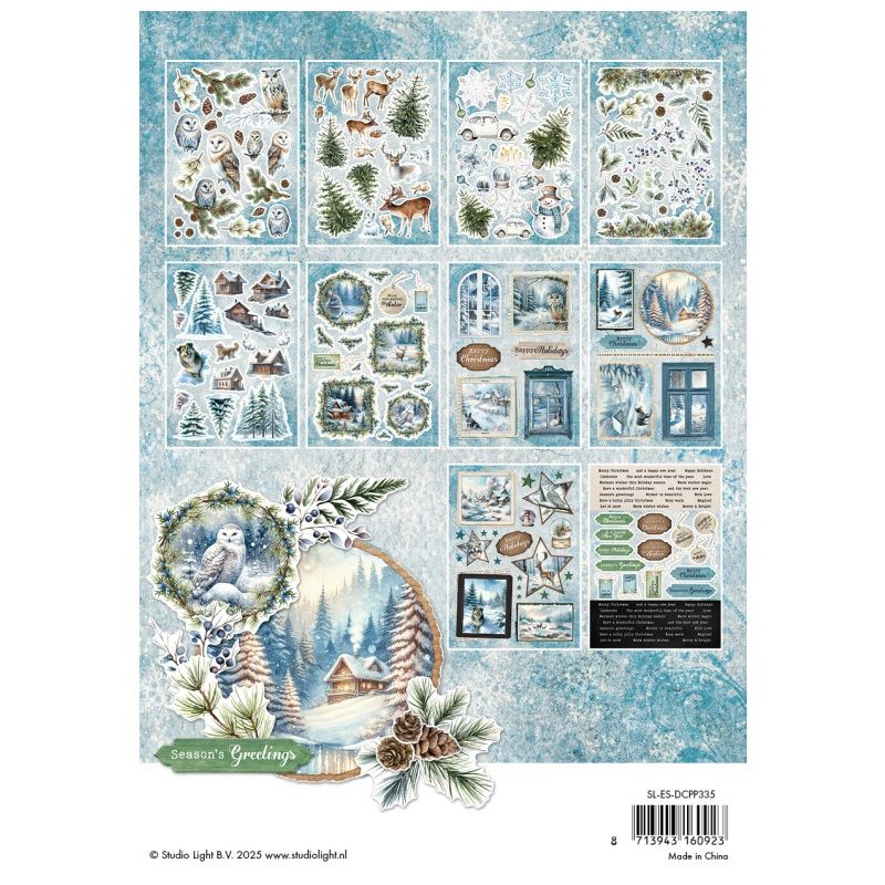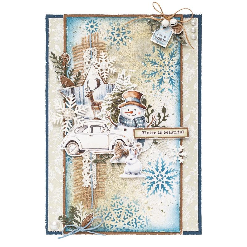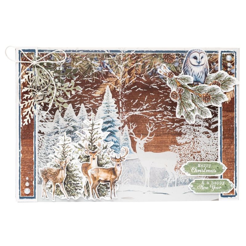 Blok obsahuje 20 listů se stovkami obrázků. Mezi motivy jsou lesní zátiší, zasněžené krajiny, jeleni, sovy a pejsci, plus anglické nápisy taky zvané „sentiments“, tzn. tematické texty vhodné na nejrůznější výrobky – ideální na zimní tvoření. Karton neobsahuje kyseliny ani lignin.