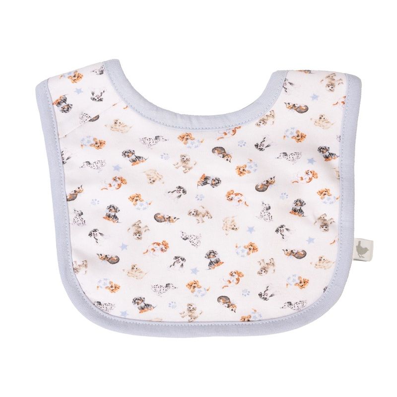 Dětské bryndáky ve sladěné sadě budou skvělým dárkem do výbavičky pro nastávající rodiče či novorozené miminko! Zdobí je akvarelové ilustrace štěňat různých plemen psů, jako jsou kokršpanělé, labradoři a jezevčíci na bílém a modrém pozadí. Vzadu je jednoduché zapínání na patentku k pohodlnému navlékání i sundávání.