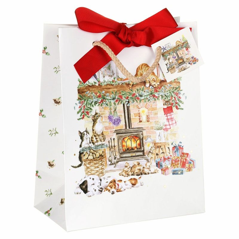 Středně velká dárková taška s originálními ilustracemi od britské firmy Wrendale Designs je ideální pod vánoční stromeček! Z obou stran je malba slavnostně nazdobeného krbu obklopeného pejsky a kočičkami. Jako všechny dárkové tašky Wrendale je taška vyrobena z kvalitního pevného kartonu a poutka jsou z příjemných pletených provázků, vršek tašky lze převázat červenou grogrénovou stužkou.