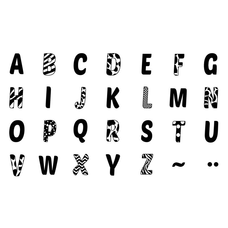 Balení obsahuje 28 razítek a razítkovací polštářek v černé barvě.