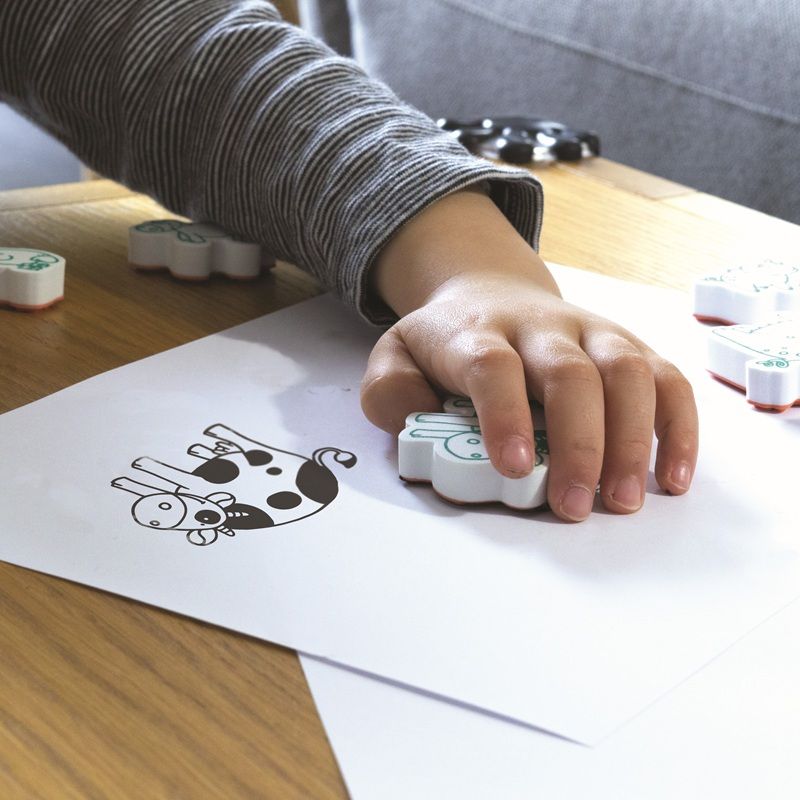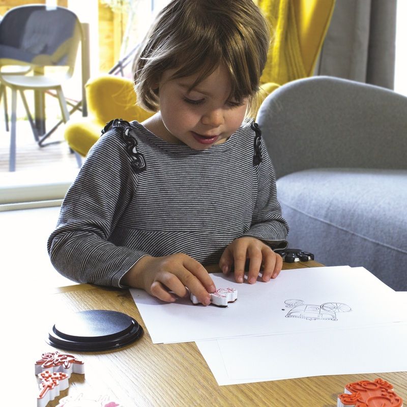 Sada obsahuje 33 razítek a černý razítkovací polštářek s vypratelným, umyvatelným a nezávadným inkoustem.