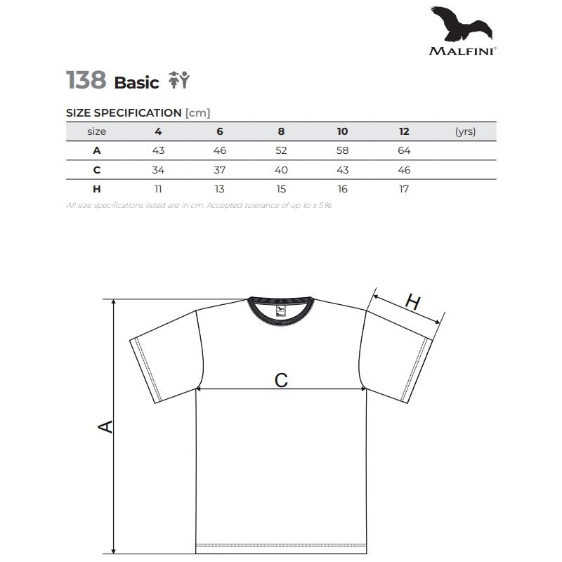 Dětské tričko Malfini Basic s krátkým rukávem. Má kulatý průkrčník s úzkým lemem z žebrového úpletu 1:1 s 5 % elastanu. Ramena jsou zpevněna všitou páskou. Triko je z žerzejového materiálu se silikonovou úpravou – to znamená, že je měkké, splývavé a jemné na omak. Je odolné vůči nečistotám a nemačkavé, zároveň ale stále elastické a prodyšné s hladkým povrchem. Vnitřní etiketa je ze saténu. Pratelné na 40 °C.