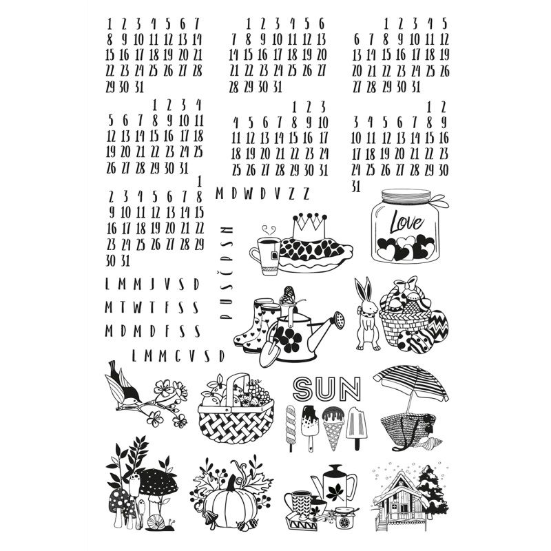 Obsahuje 25razítek s obrázkovými motivy k jednotlivým měsícům a kalendária na celý rok.