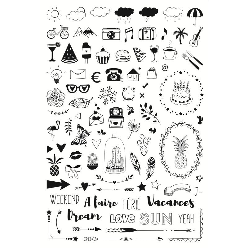 Sada obsahuje 89 razítek k vytvoření úvodní stránky měsíce i zdobení dalších stran, používají se s razítkovacími polštářky. Razítka jsou v praktickém balení – vyloupnete je z pěnové desky a po práci je můžete vrátit a snadno uskladnit.