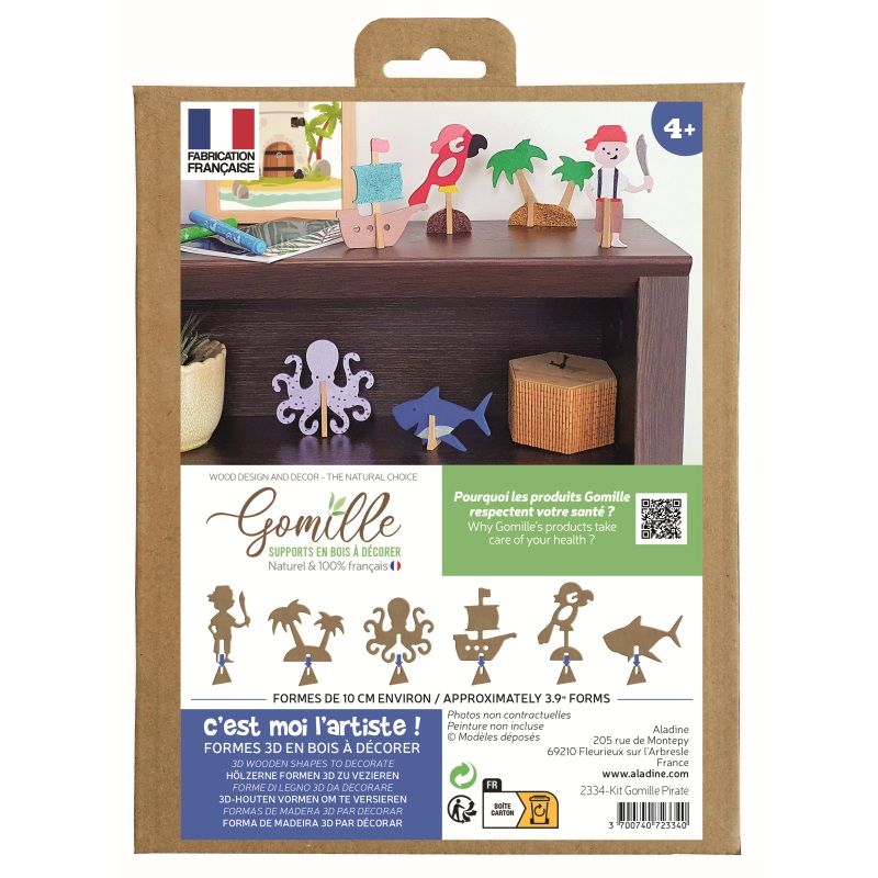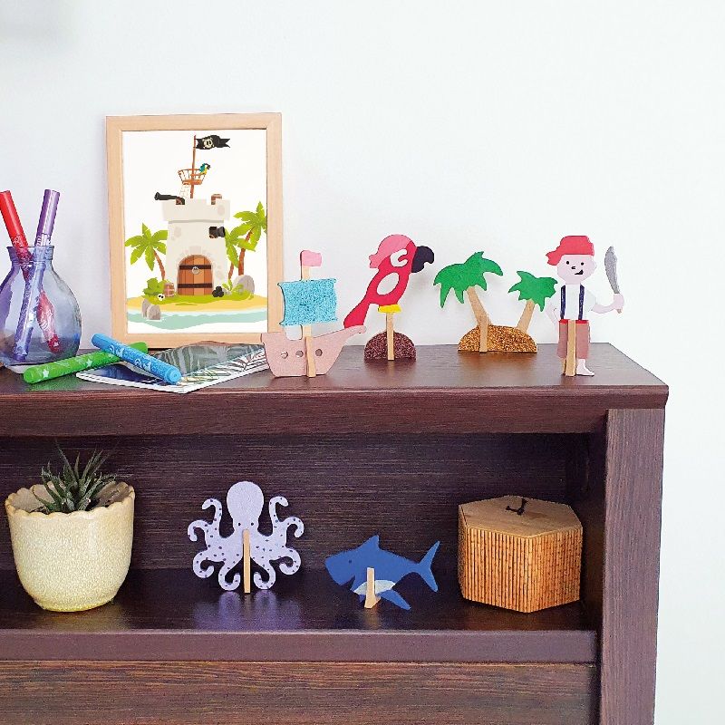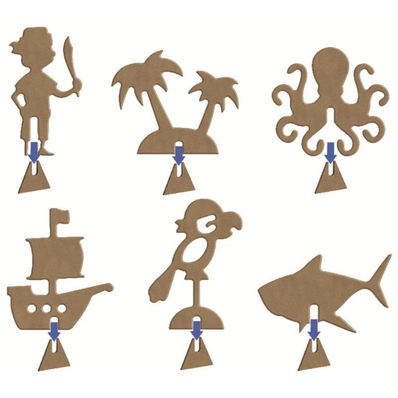 Sadička obsahuje celkem 6 dřevěných výřezů a 6 stojánků na jejich postavení – mezi motivy jsou pirát, jeho loď a věrný papoušek, osamělý ostrov i strašidelní obyvatelé oceánu. Jsou ideální k vlastnímu domalování či dokreslení, hodit se budou na hraní i vystavení v dětském pokojíčku.