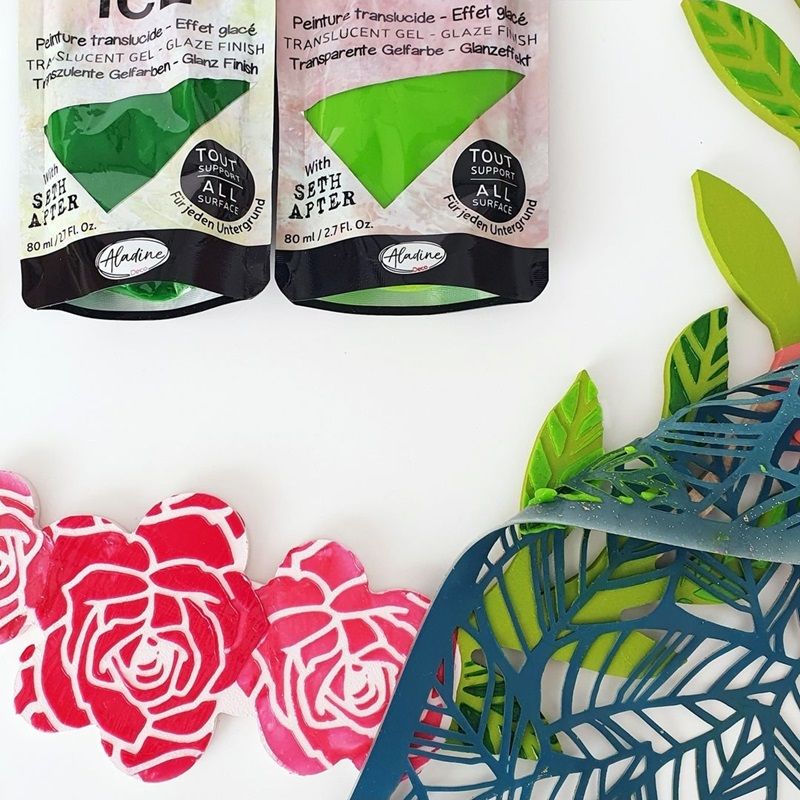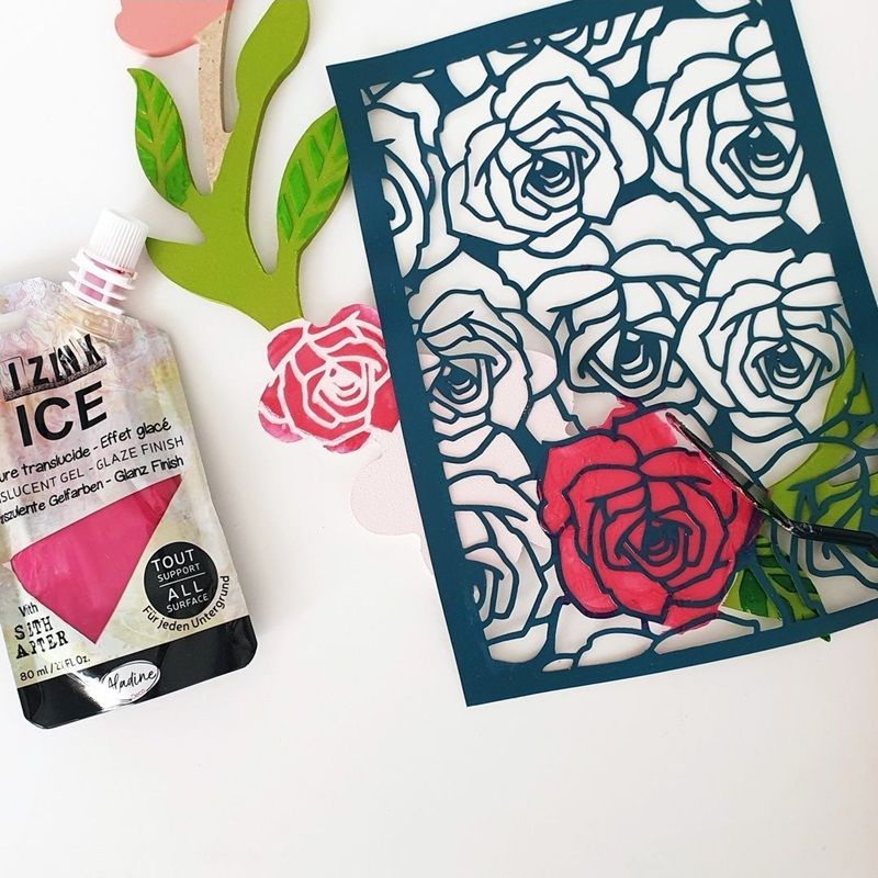 • Pastování: pokud chceme, aby výřez měl vystouplý povrch, můžeme na dřevo nanášet reliéfní pasty. Na výběr máme pasty základní nebo s efektem – metalické, třpytivé, krakelovací a další. Můžeme je nanést volně nebo jimi na výřez přenášet motivy ze šablon.