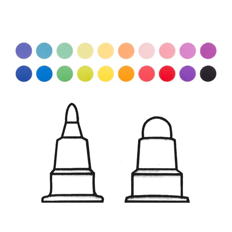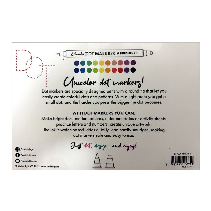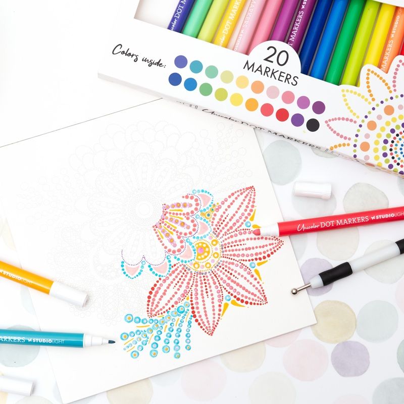 Velká sada fixů s kulatými hroty od nizozemské značky Studio Light je ideální na techniku tečkování (dot painting), při níž se tvoří oblíbené mandaly a další obrazce. Díky fixkám odpadá nutnost míchat akrylové barvy a pořizovat si speciální nástroje – můžete se plně oddat relaxačnímu tečkování!