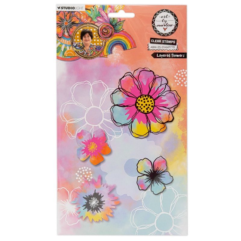 Gelová razítka v sadě s motivy květin, které navrhla umělkyně Art by Marlene , jejíž tvorba je svérázná a vesele barevná. Razítka jsou vyrobená z kvalitního čirého silikonu. Největší výhodou je jejich průhlednost – přesně vidíte, kam tisknete. Používají se s akrylovým blokem .
