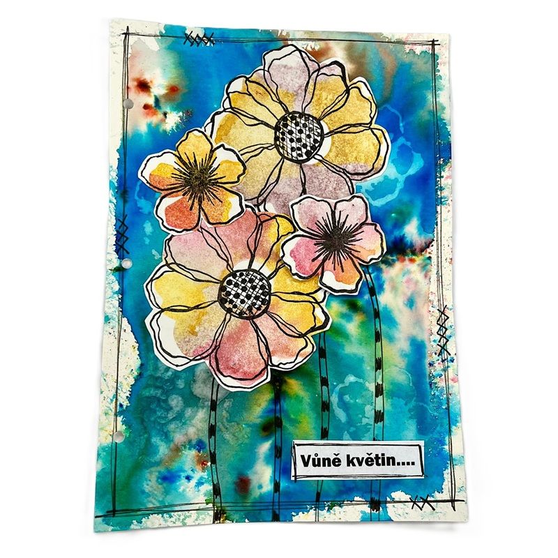 V sadě jsou jednotlivé dílky několika různých kytiček, které lze razítkovat přímo přes sebe různými barvami – začnete tmavou siluetou a přes ni narazítkujete detail okvětních lístků, není nutné se trefit přesně. Zkusit také můžete díly natisknout na papír separátně, vystřihnout je a nalepit na sebe k ještě prostorovějšímu efektu.