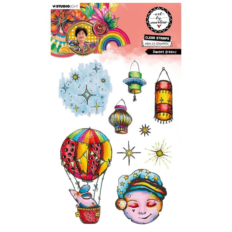 Gelová razítka v sadě se zasněnými motivy, které navrhla umělkyně Art by Marlene , jejíž tvorba je svérázná a vesele barevná. Razítka jsou vyrobená z kvalitního čirého silikonu. Největší výhodou je jejich průhlednost – přesně vidíte, kam tisknete. Používají se s akrylovým blokem .