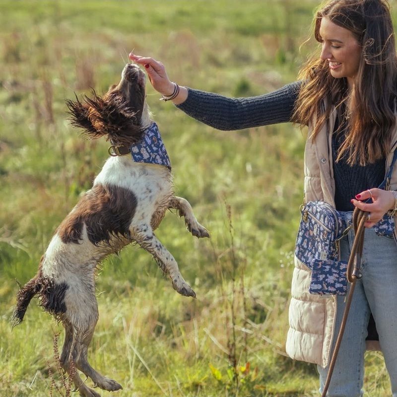 Taška má 2 hluboké kapsy uzavíratelné na zip s omyvatelnou podšívkou. Nosit ji můžete podle libosti díky dlouhému nastavitelnému popruhu o šířce 2,5 cm, který lze z tašky kompletně odepnout díky karabinám na obou koncích. Na popruhu je i extra kovový kroužek umožňující připnout další doplňky, jako třeba sladěnou tašku na pamlsky nebo taštičku na sáčky.