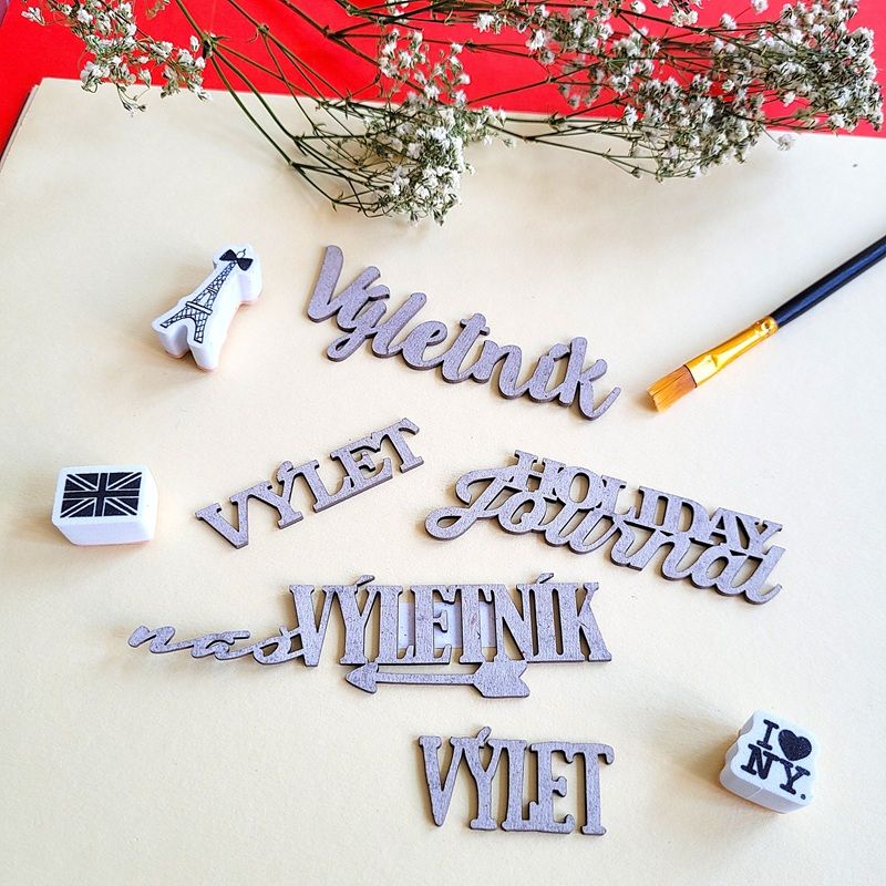 Chipboardový nápis „výlet“ pro scrapbooking, mixed media a další techniky, ideální jako ozdoba na cestovatelský deník. Rozměr 7,3 x 2 cm, tloušťka materiálu 1,5 mm.
