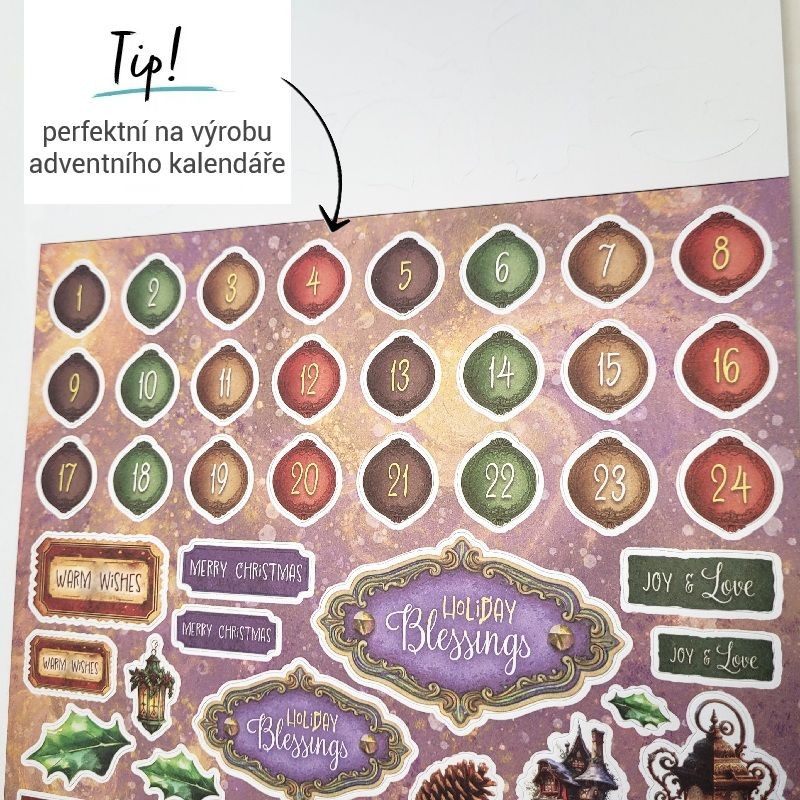 Velké podkladové papíry jsou ideální na výrobu dekorací, třeba ke zdobení dřevěných výřezů a na scrapbooking. Menší archy poslouží krásně jako přední strana přáníčka formátu A6. Mezi obrázky najdete mimo jiné vánoční víly a jejich zasněžené chaloupky, stromky, lucerničky, vánoční dekorace, mašličky, vločky a mnoho dalšího. Díky číslicím od 1 do 24 s blokem vyrobíte i vlastní adventní kalendáře.
