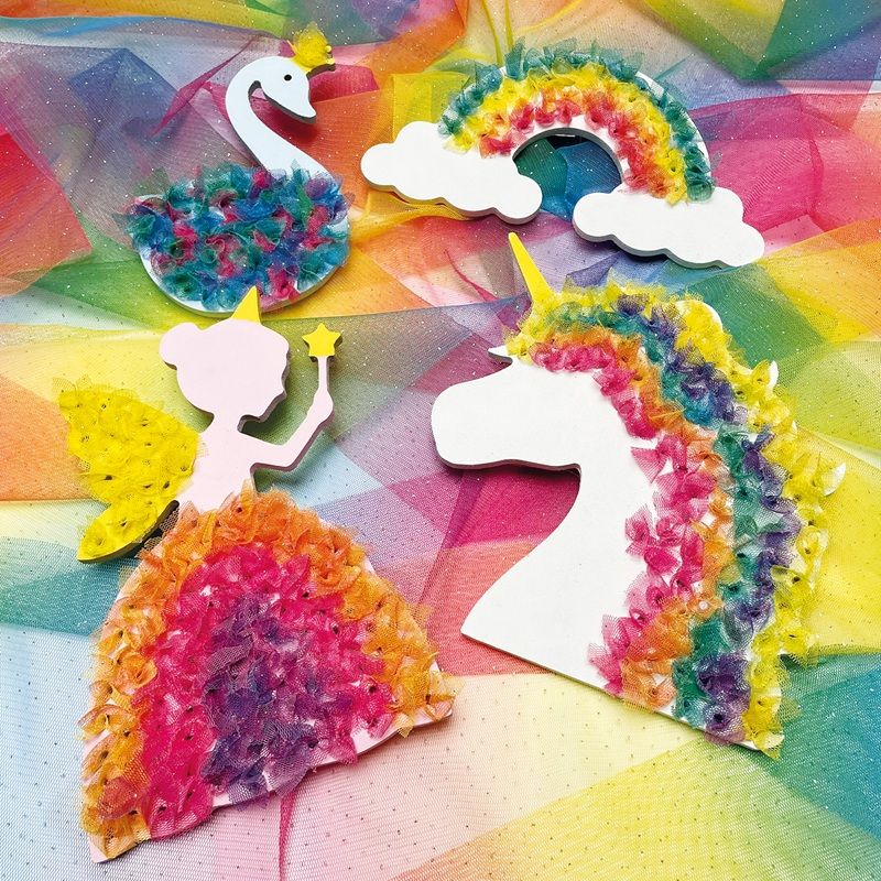 Velká sada na hraní a tvoření obsahuje všechno, co budete s dětmi potřebovat k jednoduchému vyzdobení pohádkových postaviček duhovými látkami a vytvoření originálních trojrozměrných ozdob!