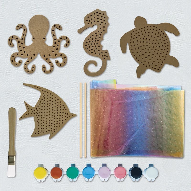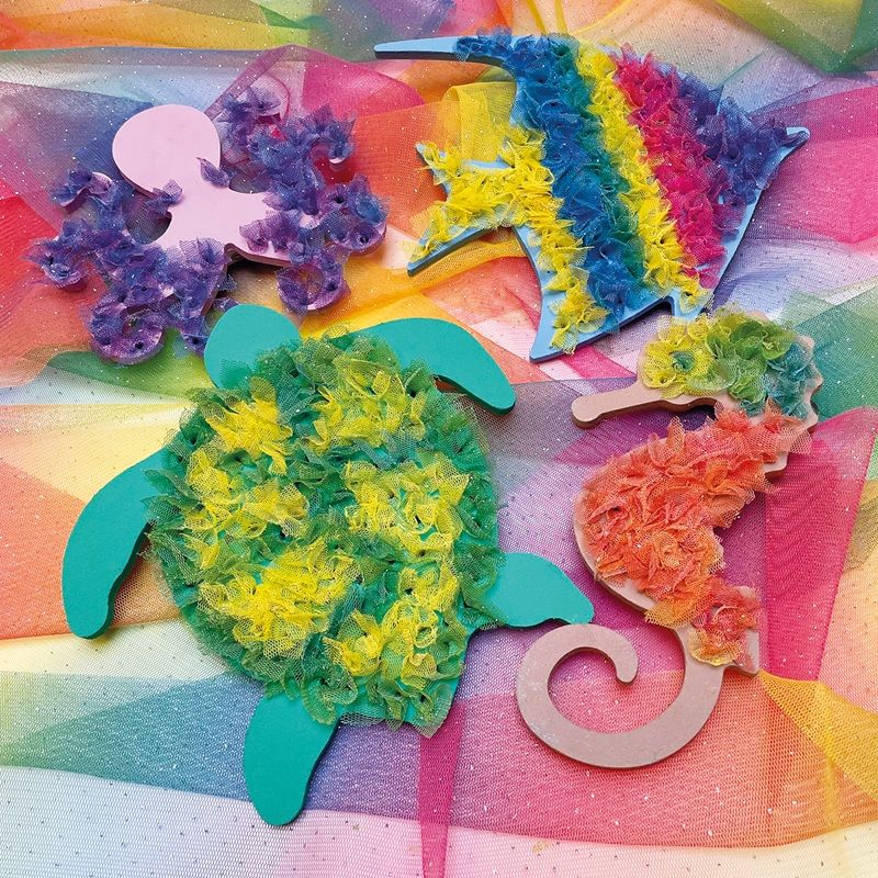 Velká sada na hraní a tvoření obsahuje všechno, co budete s dětmi potřebovat k jednoduchému vyzdobení mořských zvířátek duhovými látkami a vytvoření originálních trojrozměrných ozdob!