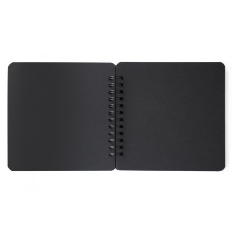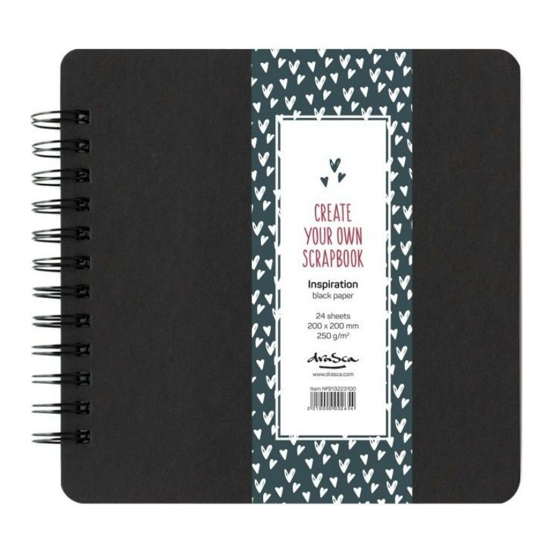 Kroužkové album s pevnými kartonovými deskami o tloušťce 1,5 mm, které jsou z obou stran polepené černým papírem, ideálním k vlastnímu dozdobení. Desky i papíry mají zaoblené rohy. Obsahuje papíry černé barvy.