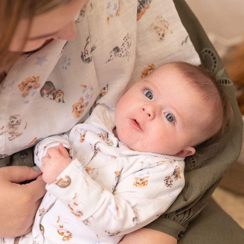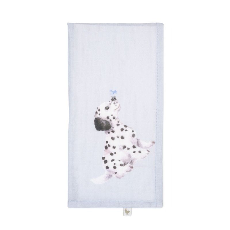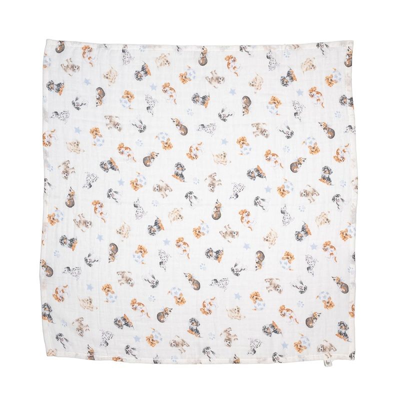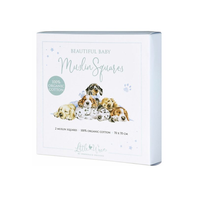 Látkové pleny jsou základem výbavičky pro miminko a tyto krásně ilustrované plenky od anglické značky Wrendale Designs si maminky zaručeně rády nechají na památku. Dárková sada obsahuje 2 klasické látkové pleny ve tvaru čtverce. První je modrá s velkými akvarelovými ilustracemi štěňátek, na druhé je vzor pejsků na bílém pozadí.