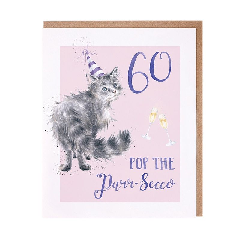 Sada přání a obálky od rodinné firmy Wrendale Designs s akvarelovou malbou kočky od britské výtvarnice Hanny Dale má na přední straně nápis „Pop the purr-secco“ – otevřeme Prosecco.