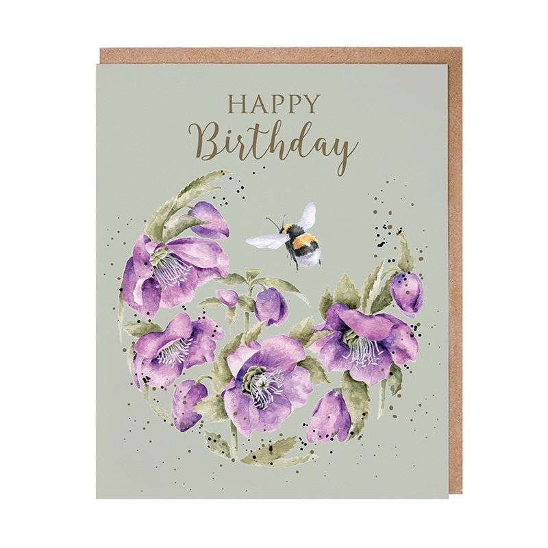 Sada přání a obálky od rodinné firmy Wrendale Designs s akvarelovou malbou čmeláka a květin od britské výtvarnice Hanny Dale má na přední straně lesklé zlaté detaily a nápis „Happy birthday“ – vše nejlepší k narozeninám.