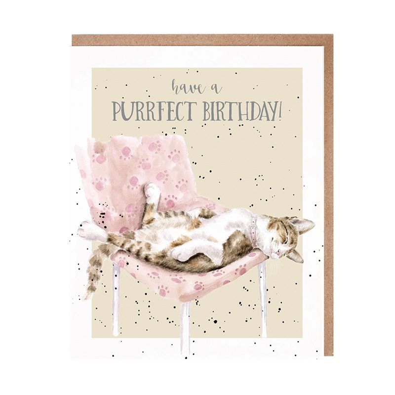 Sada přání a obálky od rodinné firmy Wrendale Designs s akvarelovou malbou spokojené kočičky od britské výtvarnice Hanny Dale má na přední straně nápis „Have a purrfect birthday“ – vše nejlepší k narozeninám.