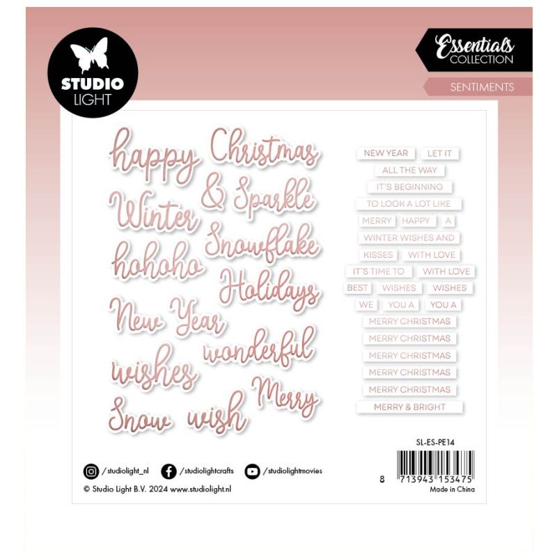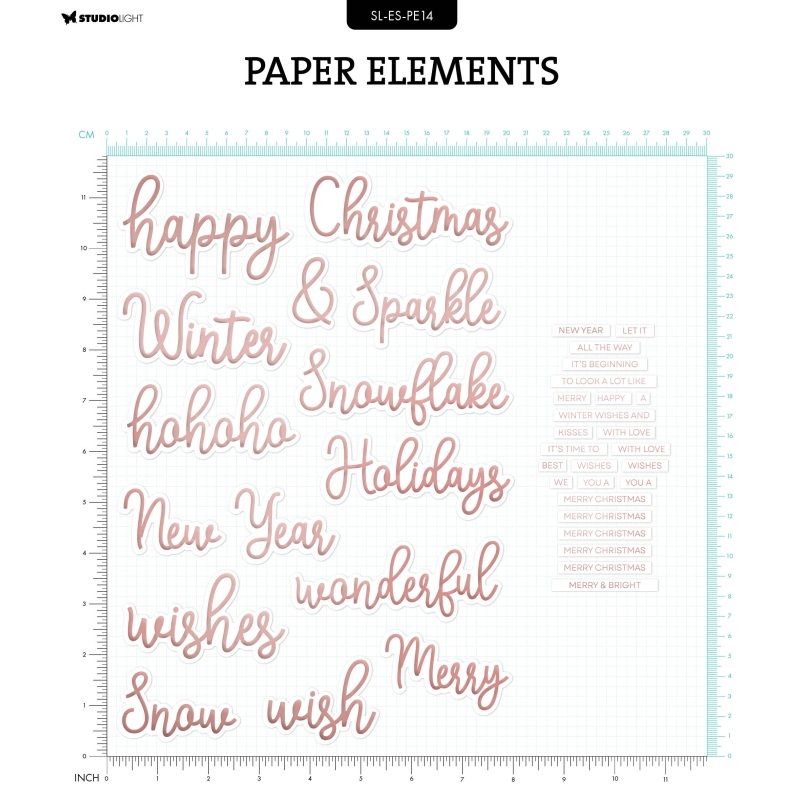 Sada dekorativních papírových výseků s motivy vánočních nápisů v angličtině určených převážně k papírovému tvoření. Nápisy samotné jsou metalicky lesklé a mají kolem sebe bílý rámeček.