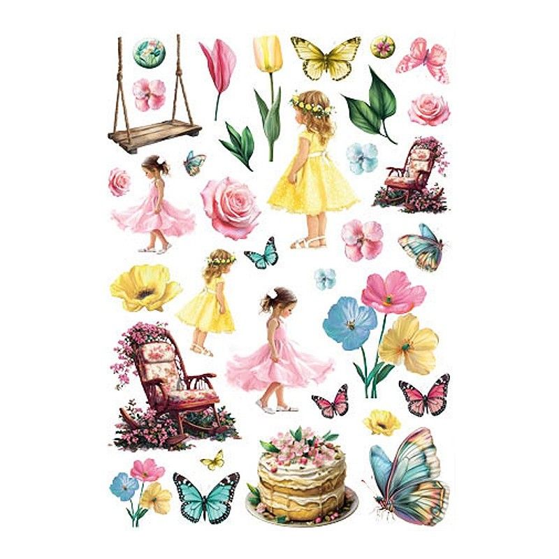 Sada dekorativních papírových výseků s motivy kytiček, motýlů a sladkých holčiček určených převážně k papírovému tvoření. Obrázky jsou obzvláště vhodné ke kolážování, na stránky art journalu nebo na cardmaking – výrobu přání. Žádný z motivů není třeba vystřihovat, stačí jen nalepit na projekt pomocí tekutého lepidla , lepicí pásky nebo lepicích 3D polštářků.