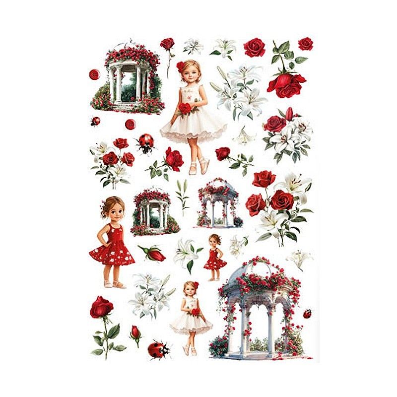 Sada dekorativních papírových výseků s motivy růží, romantických altánků a sladkých holčiček určených převážně k papírovému tvoření. Obrázky jsou obzvláště vhodné ke kolážování, na stránky art journalu nebo na cardmaking – výrobu přání. Žádný z motivů není třeba vystřihovat, stačí jen nalepit na projekt pomocí tekutého lepidla , lepicí pásky nebo lepicích 3D polštářků.