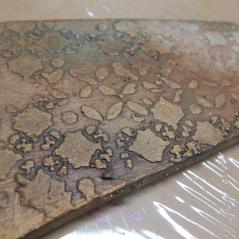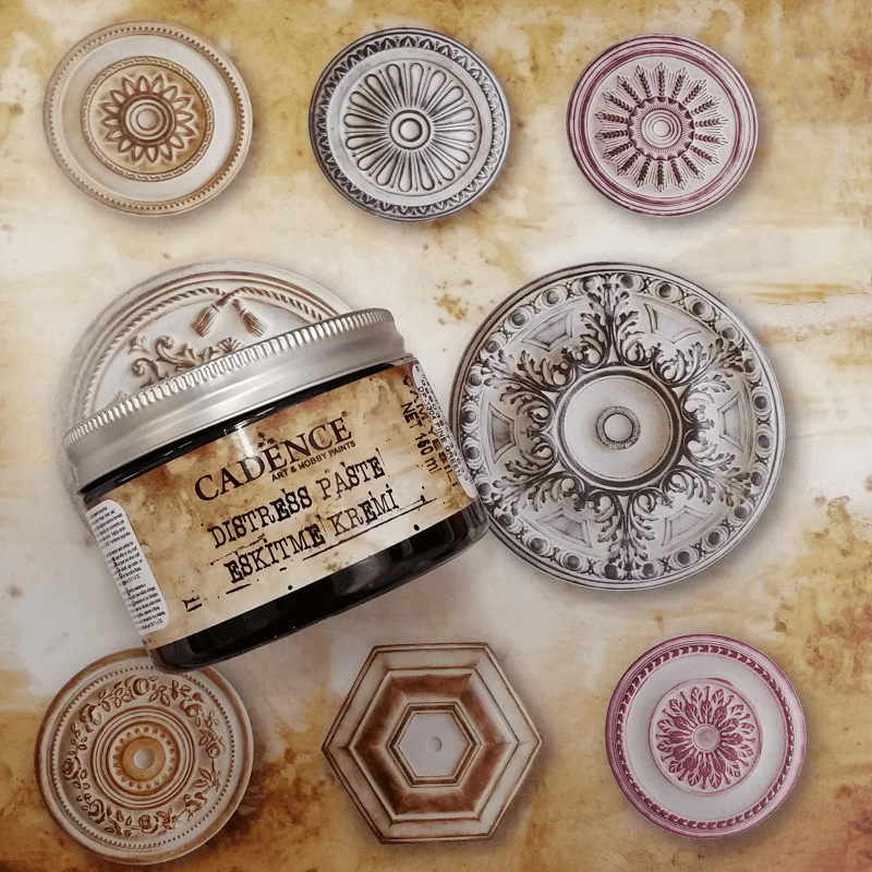 Například můžeme na dřevěný povrch nanést nejprve klasickou reliéfní pastu , která za použití šablony vytvoří matně bílý vzor. Po zaschnutí pak přes vytvořený motiv naneseme Distress pastu. Tu pak pomocí mokrého štětce, houbičky nebo vlhčeného ubrousku otíráme tam, kde je nanesená na klasické reliéfní pastě, čímž jí vytvořený motiv zesvětlá a bude zajímavě vystupovat do prostoru. Mějte však na paměti, že klasická reliéfní pasta se vlhkostí znovu aktivuje – při aplikaci dalších barev je nutné postupovat jemně, aby se její vrstva neporušila.