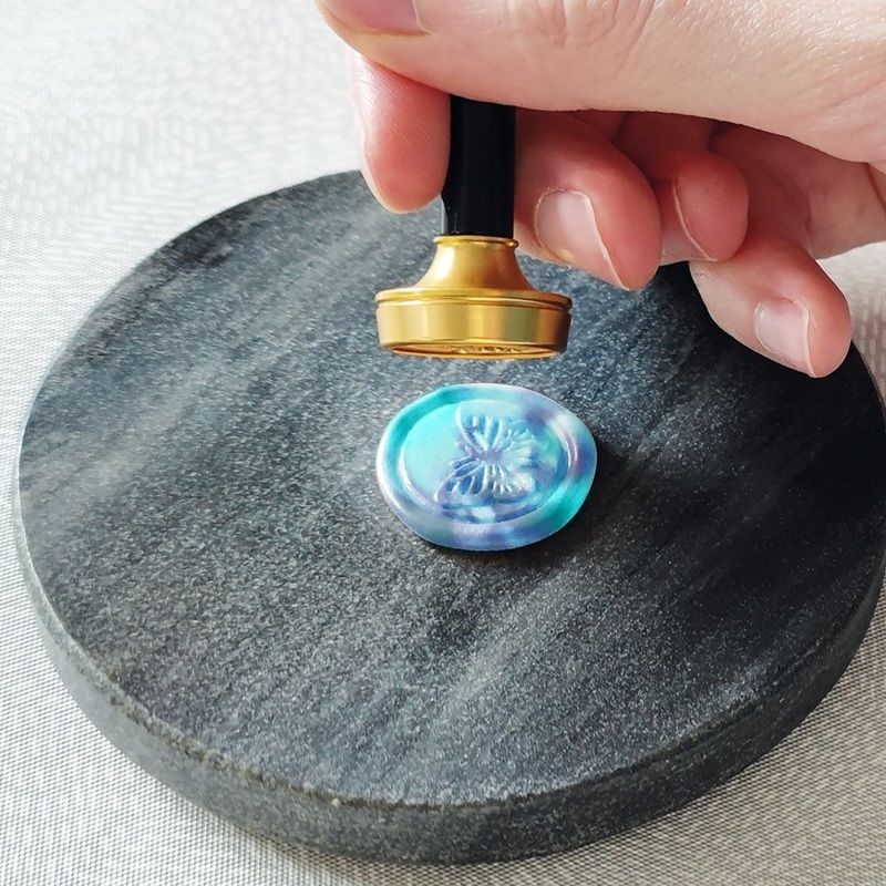 Pečetidlo je vyrobeno z mosazi a má průměr 2 cm. Motivem je motýlek, kterého lze na hotové pečeti zvýraznit pomocí akrylového fixu , díky němuž bude ještě lépe vidět.