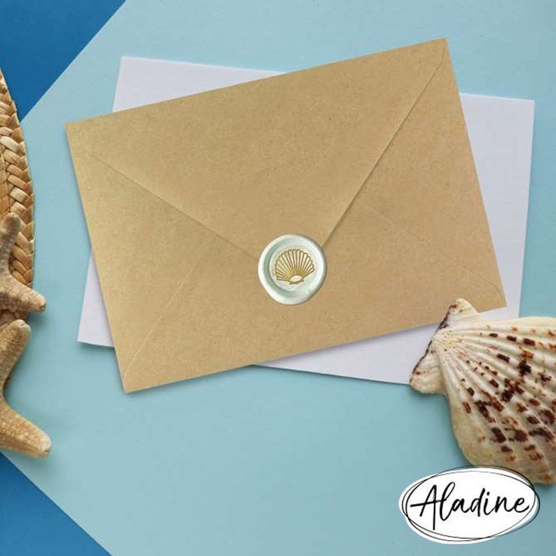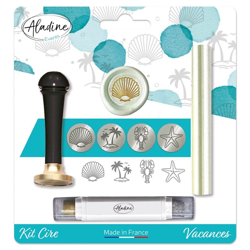 Souprava na výrobu pečetí obsahuje všechny komponenty pro techniku pečetění – ideální k výrobě přáníček, visaček, pozvánek, dárků a mnoho dalšího. Obsažená pečetidla mají mořské motivy, jsou vyrobena z francouzské mosazi a mají průměr 2 cm.