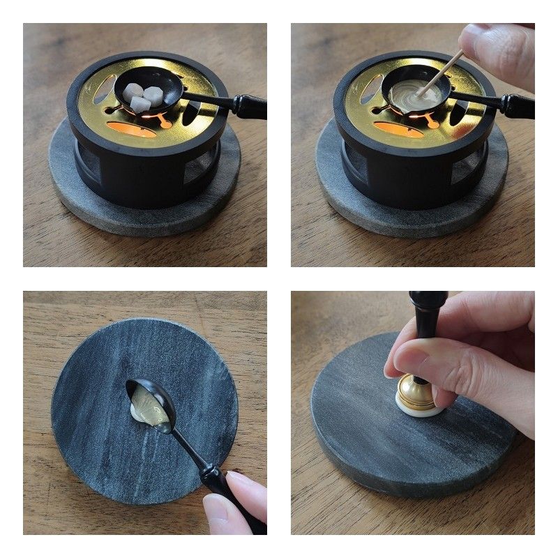 3. Tekutý vosk lžičkou nalijte na svůj projekt a jemně do něj přitlačte kovové pečetidlo , které tam podržte cca 15 sekund. Opatrně uvolněte pečetidlo a nechte pečeť zcela zatvrdnout.
