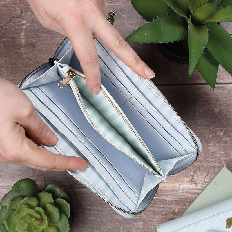 Velká dámská peněženka bude ideálním doplňkem pro náročné – hlavní kapsa je uzavíratelná na zip, uvnitř jsou z obou stran velké přihrádky na bankovky a účtenky, které doplňuje celkem 8 menších kapsiček na karty, čipy a žetony. Uprostřed je velká kapsa na zip pro uschování mincí.