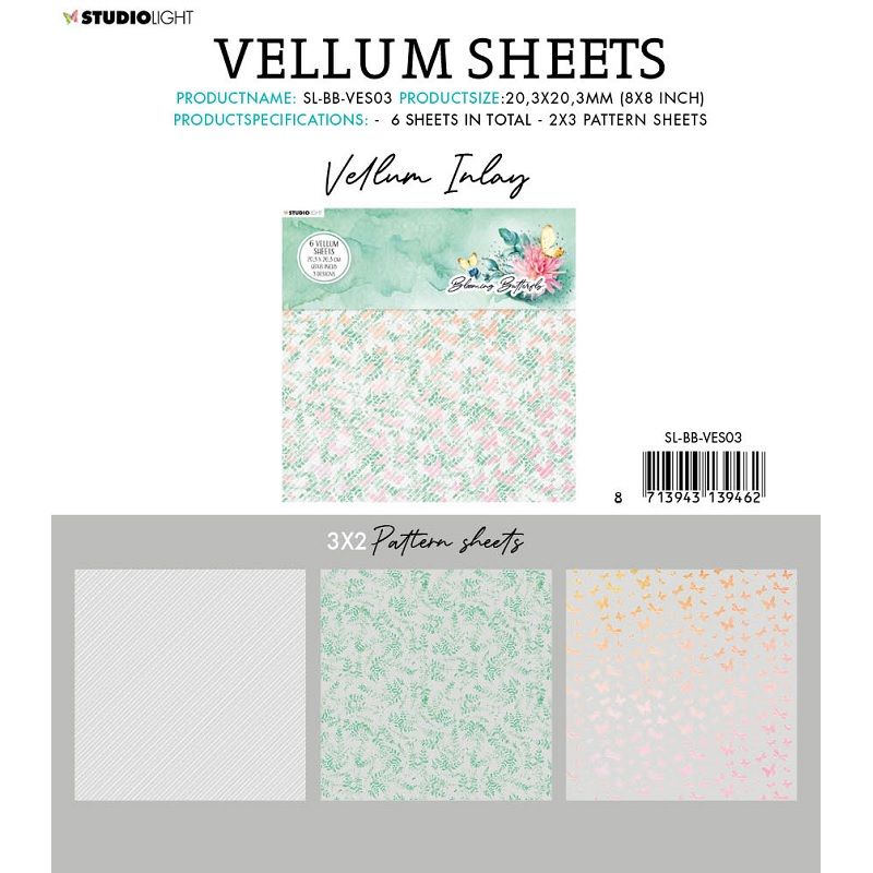 Vellum neboli pauzovací papír z kolekce Blooming Butterfly je výrazný dekorační prvek s drobnými motivy motýlů, rostlin a pruhovaného vzoru, které jsou barevně natisknuty na jemném pergamenovém papíru.