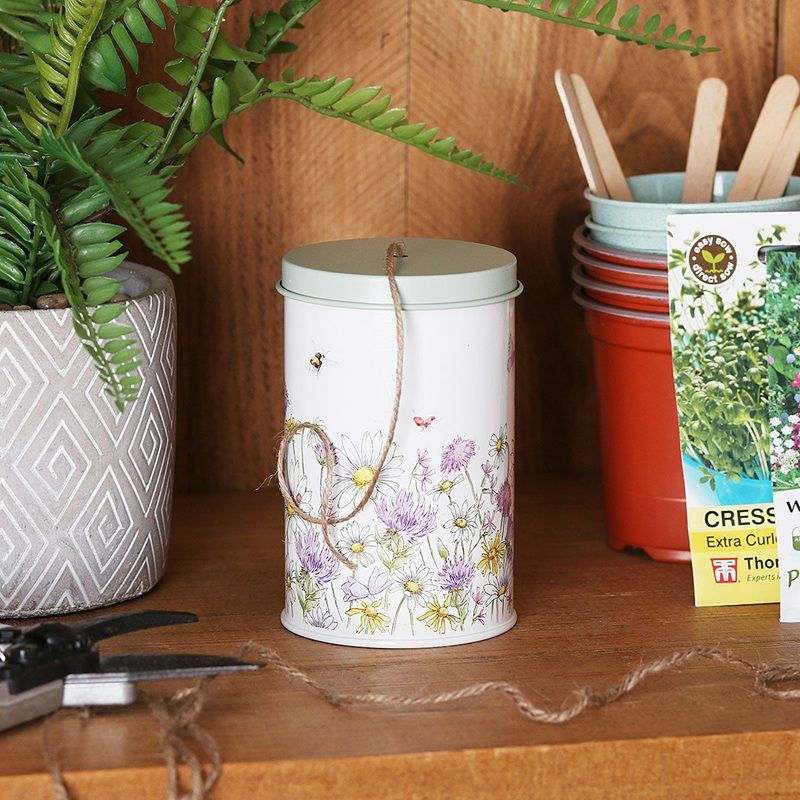 Dózičku zdobí kolem dokola akvarelové ilustrace rozkvetlé louky se včelkou, takže bude nejen praktickým pomocníkem, ale i originální ozdobou. Obzvlášť doporučujeme jako dárek pro zahradnici spolu s dalšími designovými doplňky na zahradu a dárky pro domov .