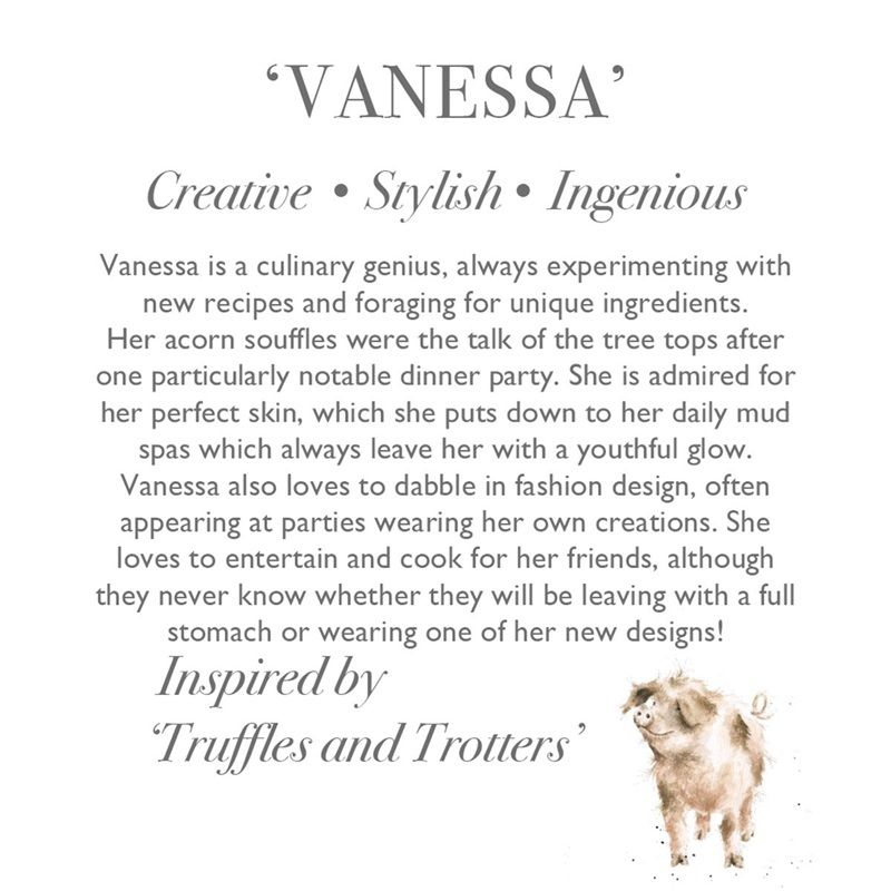Prasátko Vanessa je kulinářský génius, neustále experimentuje s novými recepty a shání nevšední ingredience. Po jedné obzvlášť vyvedené párty se nemluvilo o ničem jiném než o jejím žaludovém suflé. Všichni se obdivují její dokonalé pleti, kterou sama připisuje denním bahenním koupelím, díky nimž si zachovává svůj mladistvý vzhled. Vanessa se také trochu rýpe v módním návrhářství a často se na večírcích objevuje ve svých vlastních výtvorech. Je nadšená hostitelka, ale její přátele si nikdy nejsou jistí, jestli budou odcházet s plným bříškem nebo oblečeni v jednom z jejích módních kousků!