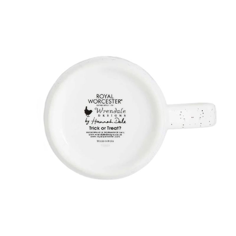 Hrneček s potiskem halloweenských pejsků vyrobený z kostního porcelánu firmou Royal Worcester. Má stejný obrázek na přední a zadní straně, vnitřní okraj zdobí nápis. Vhodný do myčky i mikrovlnky. Objem 400 ml. Celý popis