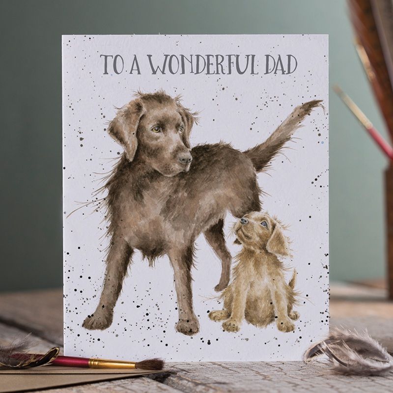 Sada přání a obálky od rodinné firmy Wrendale Designs s akvarelovou malbou labradora a štěněte od britské výtvarnice Hanny Dale má na přední straně nápis „To a wonderful dad“ – pro skvělého tátu. Skvěle se bude hodit k narozeninám, svátku nebo ke dni otců .