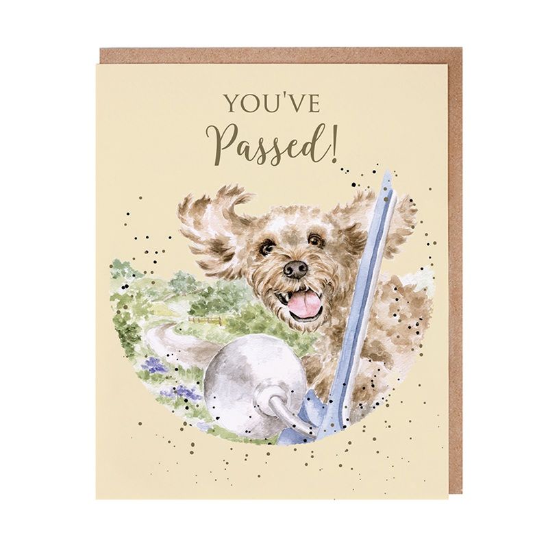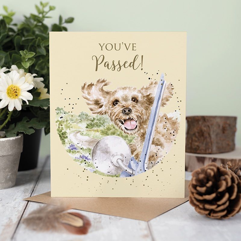 Sada přání a obálky od rodinné firmy Wrendale Designs s akvarelovou malbou pejska v autě od britské výtvarnice Hanny Dale má na přední straně lesklé zlaté detaily a nápis „You've passed!“ – uspěl(a) jsi. Skvěle se bude hodit jako vtipná gratulace ke splnění jakékoli zkoušky, ale obzvlášť k získání řidičského průkazu.