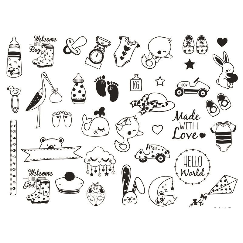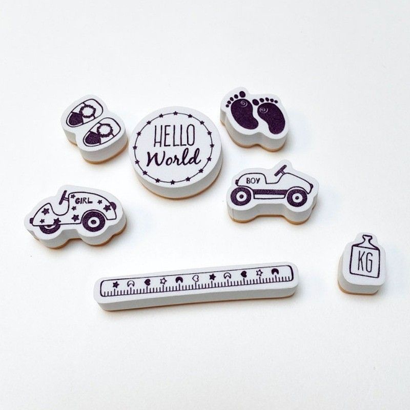Originální sada gumových razítek k tvorbě blahopřání k narození miminka, dětských fotoalb, ale i pro výrobu dekorací do pokojíčku apod. Perfektně vám poslouží i při dětské oslavě - zápichy do muffinů, označení skleniček, vlaječky, krabičky na dobroty atd.