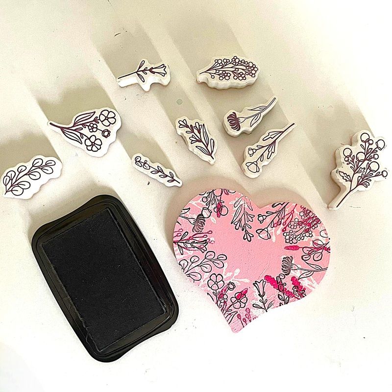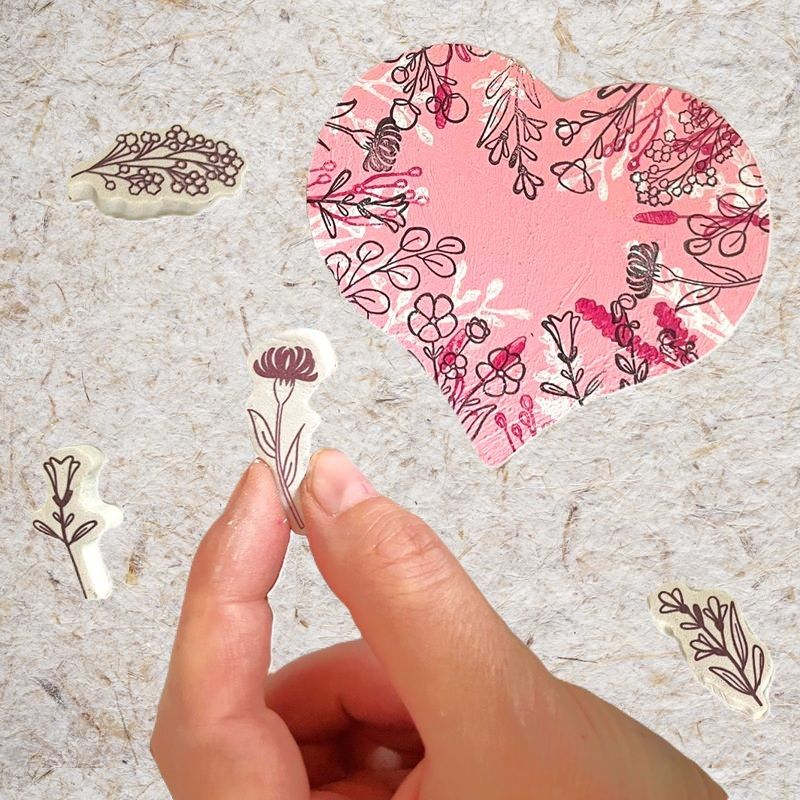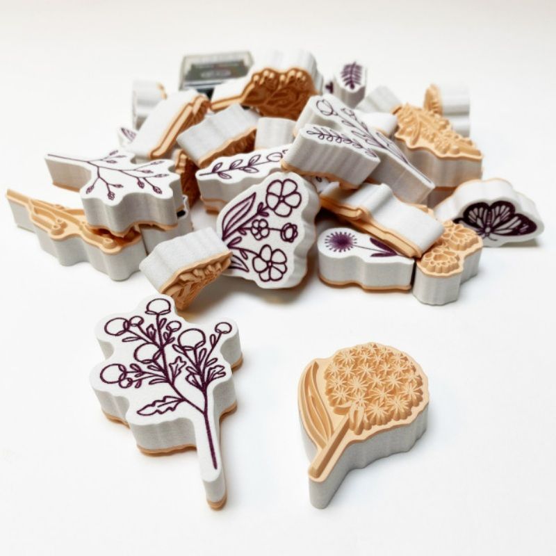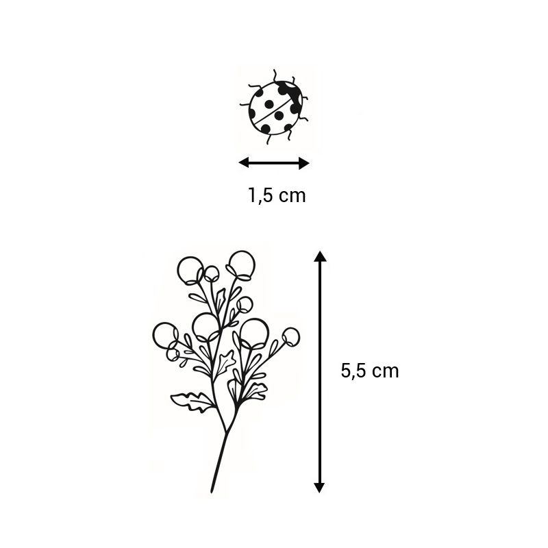 Sada originálních gumových razítek s kvalitní hlubokou texturou a s motivy květin, včelek, berušky a vážky. Razítka skvěle využijete při výrobě drobností z papíru, při zdobení textilu, tvoření s keramickou hlínou, tvorbě mixed media koláží nebo k dozdobení Bullet Journalů.