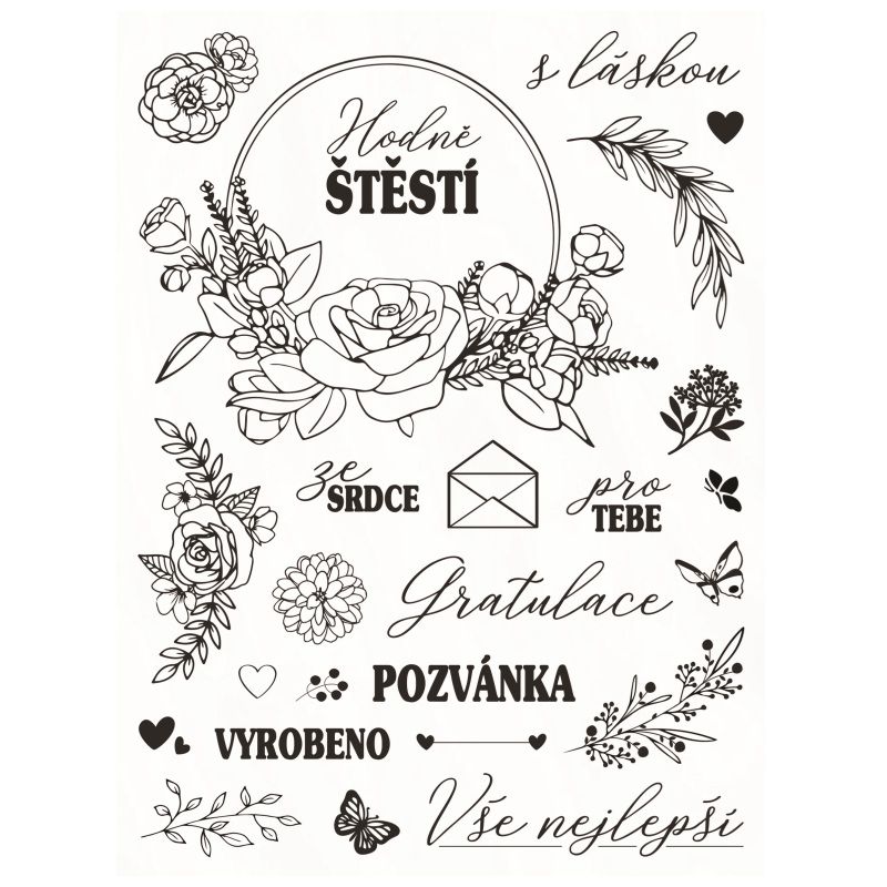 Set 25 razítek s motivy květin a českých nápisů pro celoroční tvoření. Součástí balení jsou i 3 razítkovací polštářky – tmavě růžový, světle růžový a černý. Razítka jsou v praktickém balení – jen je vyloupnete z pěnové desky, poté je můžete vrátit a snadno uskladnit.