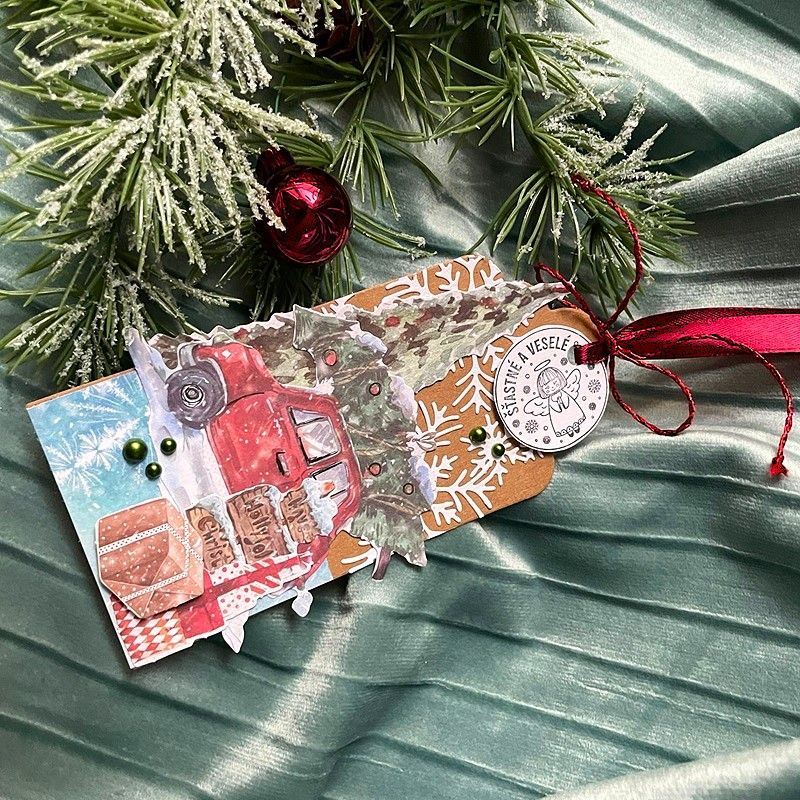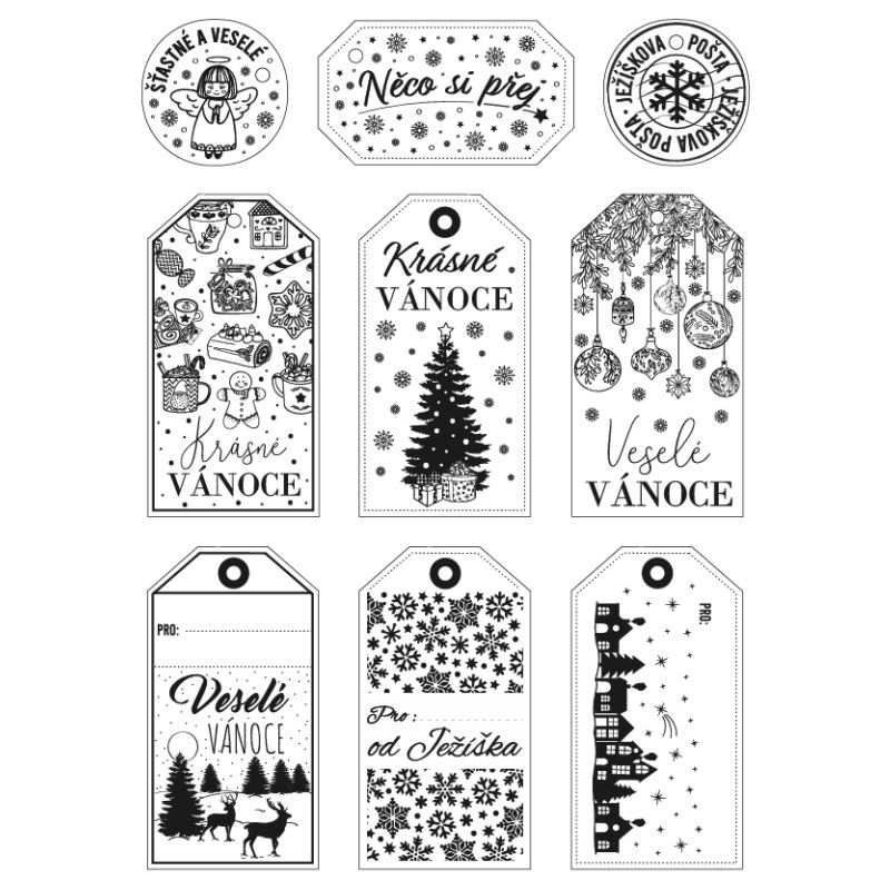 Sada obsahuje 9 razítek s českými nápisy ve tvaru visaček, koleček a štítku. Součástí balení jsou i 3 razítkovací polštářky Quick Dry na papír – černý, bílý a červený. Visačku stačí narazítkovat na papír, vystřihnout a děrovačkou na vyznačeném místě vytvořit dírku k zavěšení.